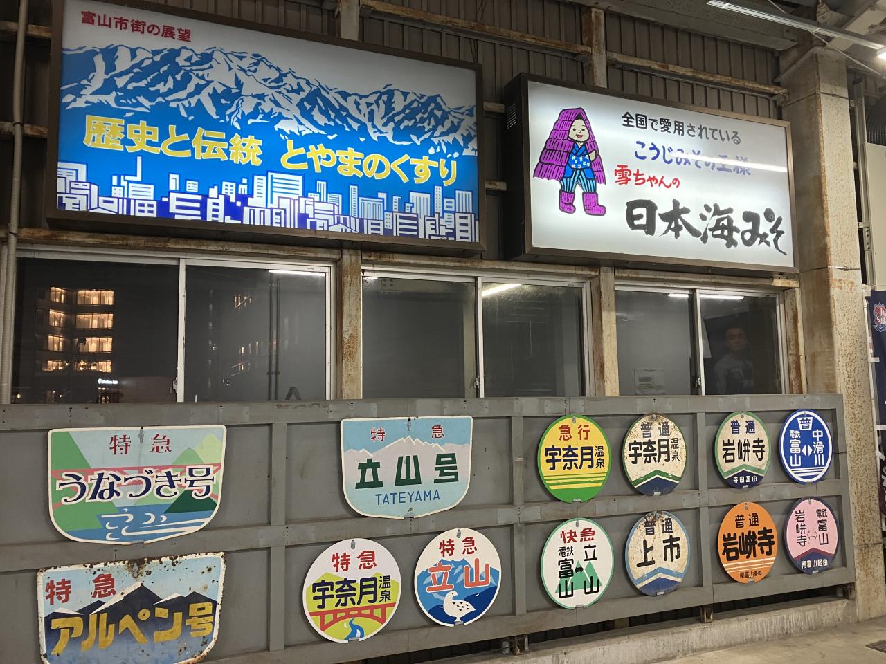 向こうの方に「日本海みそ」の看板。子どもの頃大阪でもCMやってました「♪~笑顔ひーふーお味噌汁~……あーあ越中、日本海みそ」て歌えたりします。