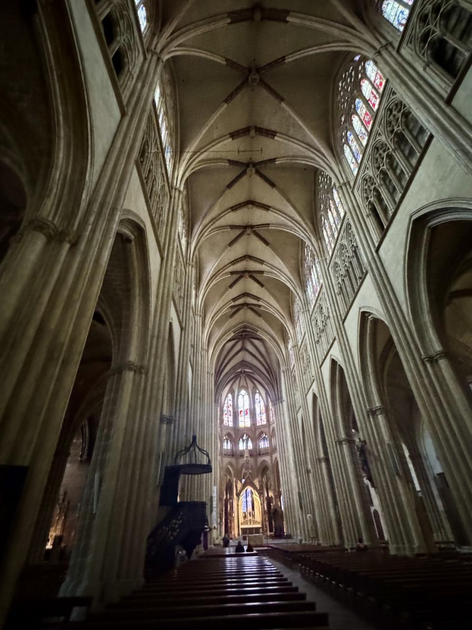 13~14世紀に建てられた、リブ・ヴォールトというアーチを平行に押し出した形状(かまぼこ型)の天井にステンドグラスという、中期ゴシックスタイルの教会です。真上から見ると、身廊がラテン十字の形をしているんだそうです。 -