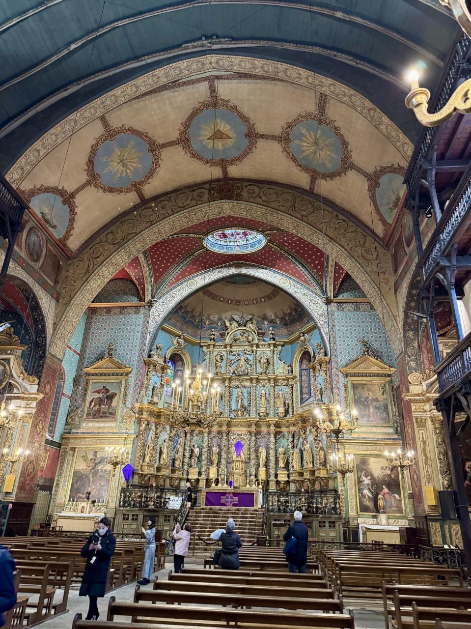 教会の中に入ると、巨大な祭壇装飾が目に入ります。私は優しいブルーの壁や、天井の装飾が気に入りました。
