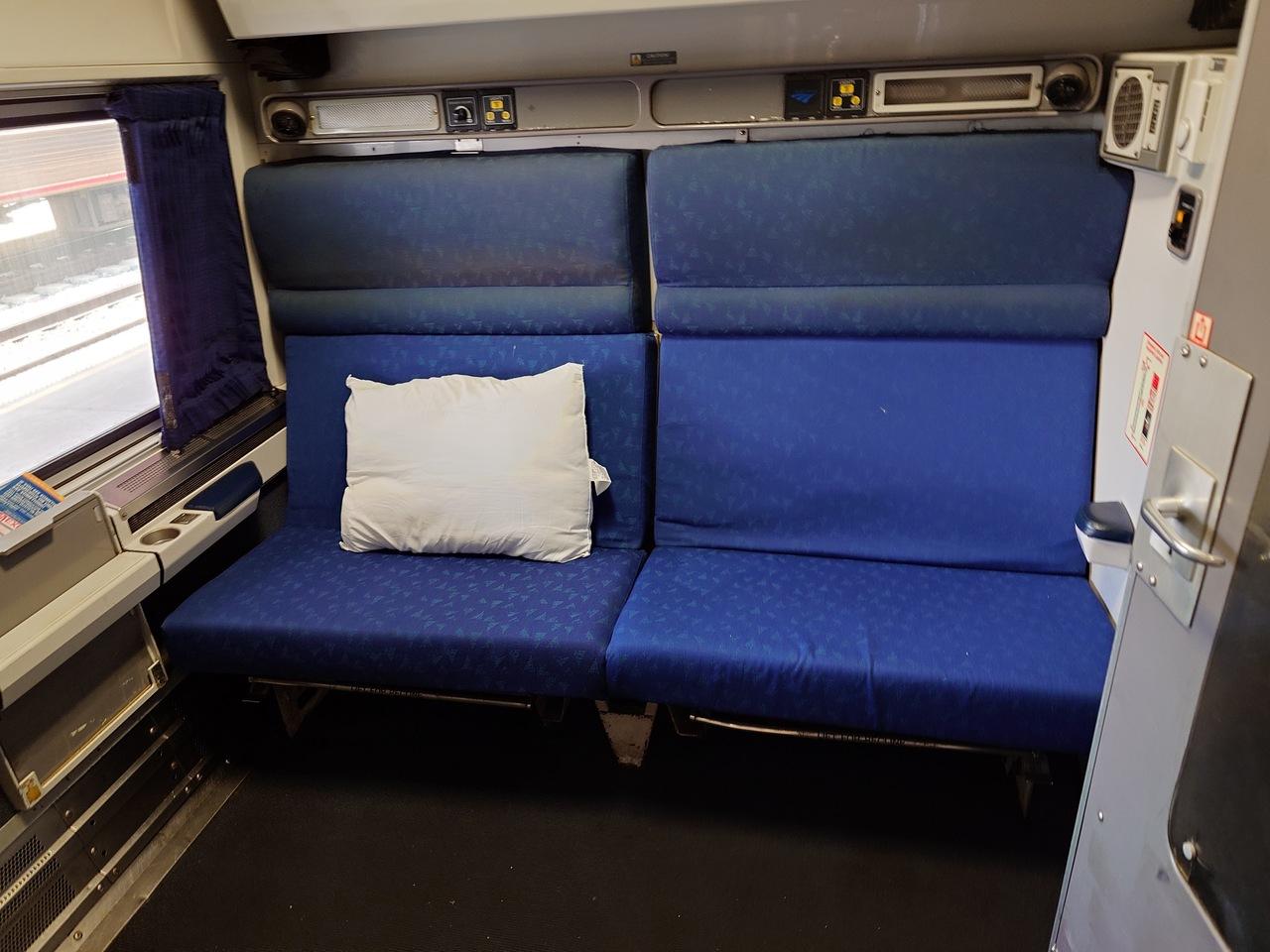 ツインの反対側から見た 座席 風景です。注目は左の段差、この部屋は2人用なので2段ベッドにする時はこのステップを上がっていく。なお、上の段が折りたたみ式の洗面台兼用。