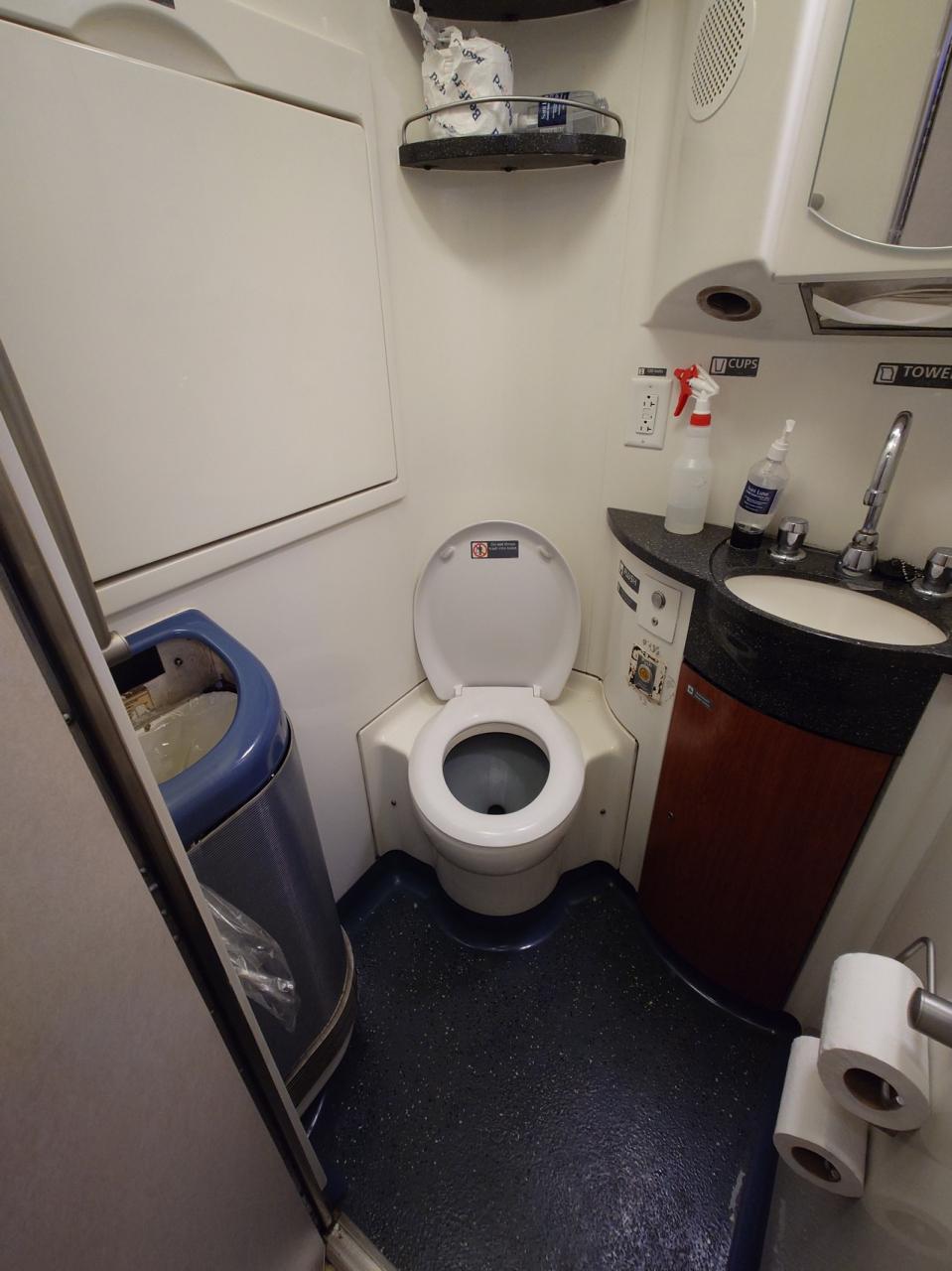 ここで問題発生、トイレに行っている時にロックアウトされました。この個室は外側から鍵をかけられないタイプなので、出かける時はドアを閉めるだけ、運行中のはずみで鍵がかかったのかと思われます。
