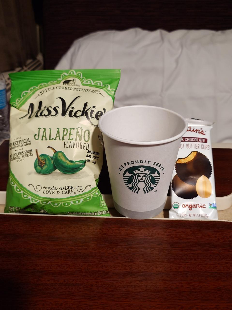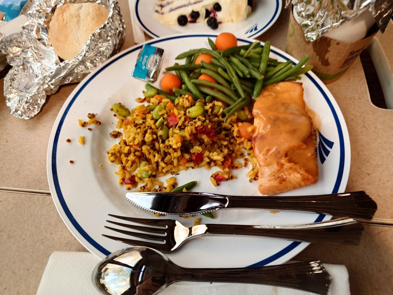 18時前にディナー 到着、メインは私が頼んだ サーモン以外にチキンやパスタ、デザートは このチーズケーキ かチョコレートケーキのどちら、飲み物のオーダーは アルコール類は8ドルで追加可能。コーヒーを頼みましたが スターバックス マーク入りでした。チーズケーキはドロ甘で少し残しましたが、これだけで終えれば比較的ヘルシー。パンは食べません。写真で見るとちゃんとした皿と カトラリーに見えますが 全部使い捨て、皿は持ち帰れるなら…気分→持ち帰りチャレンジしました(笑)