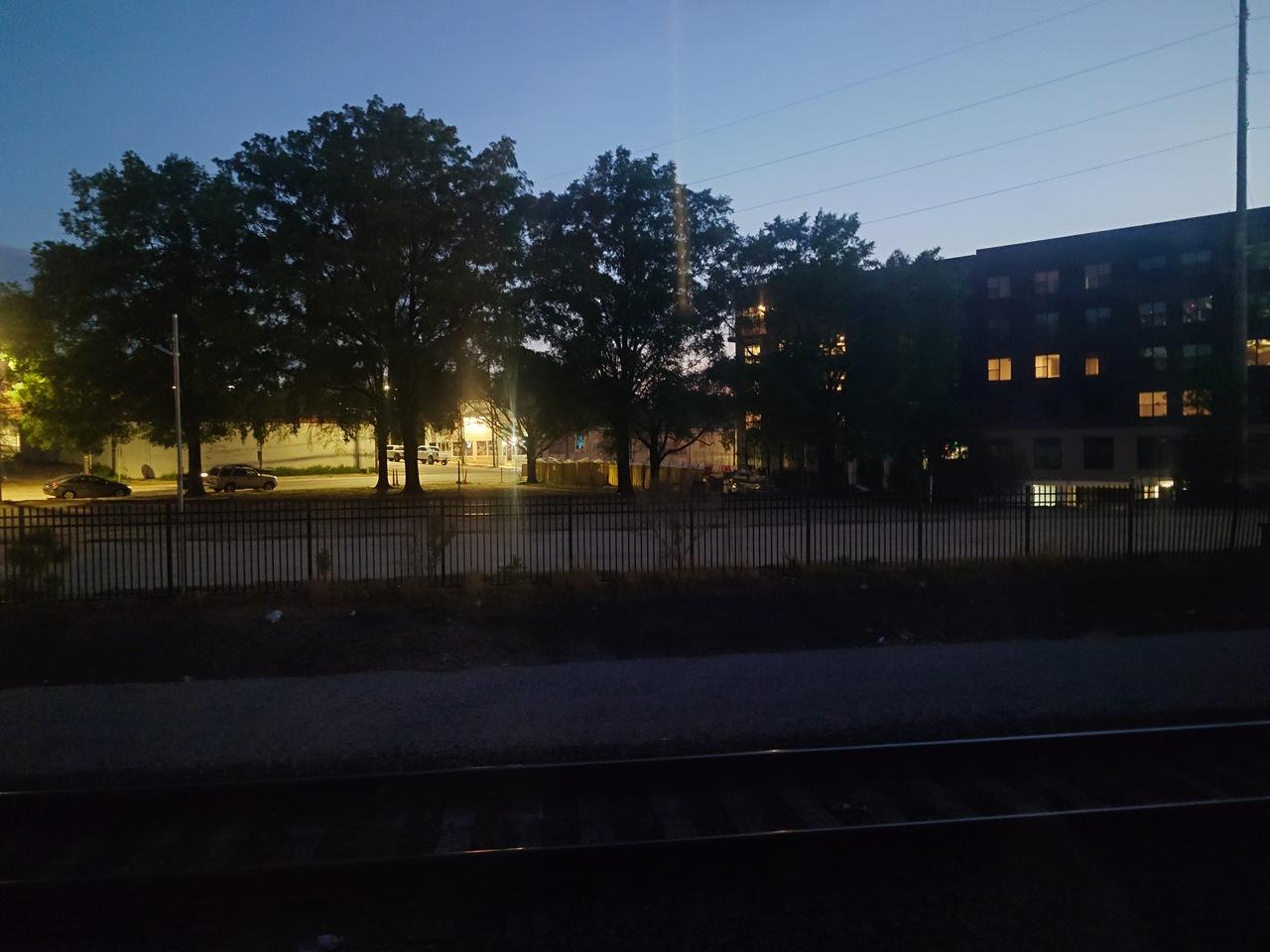 20時、ノースカロライナ州のローリー 駅。ここで約10分の遅れまで回復と思ったら20分 近く停車したので 結局同じです(笑)この30分ぐらい前が夕暮時でとても良い景色だったんですが、その時に限って スピードが速くて撮れませんでした。