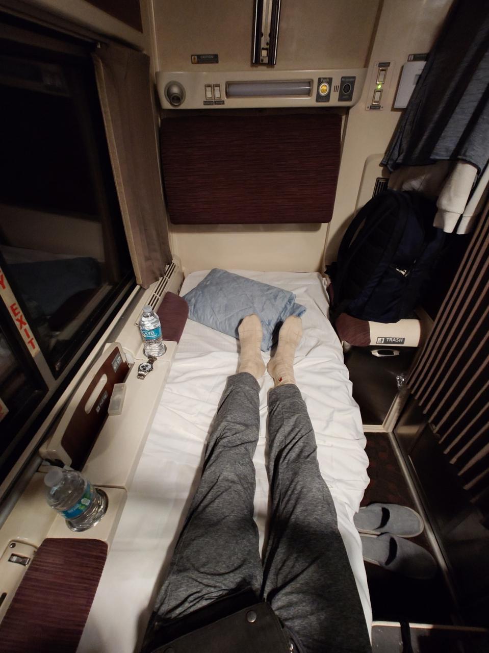 夜9時半頃に 車掌が来て ベッドメイクをしてくれました、上段のベッドからセットされている敷布団を下ろして引いて 、掛け布団を下ろすだけなので知っていれば自分でもできそうです。