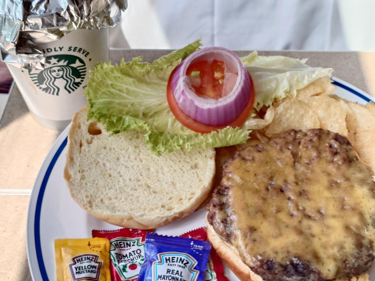 12時前に提供された昼食、ハンバーガー以外にシーザーサラダとチキン料理がありました。デザートも見たい興味はあったけどさすがに 全く食べないと思ったのでパス。ハンバーグ 部分はよく言えば 牛肉100%のパテ、相当な硬めです。味は決して悪くはないけどいかにもアメリカって感じです。すでに相当なブロイラー状態なので、ポテトチップ と上のバンズは全捨てしました(笑)今回も 部屋食 にしましたが 1人のお客さんはほとんど 部屋にしている感じです、おそらく相席っていう概念はアメリカにはないでしょうから一人では彼らも行きにくいのかな。