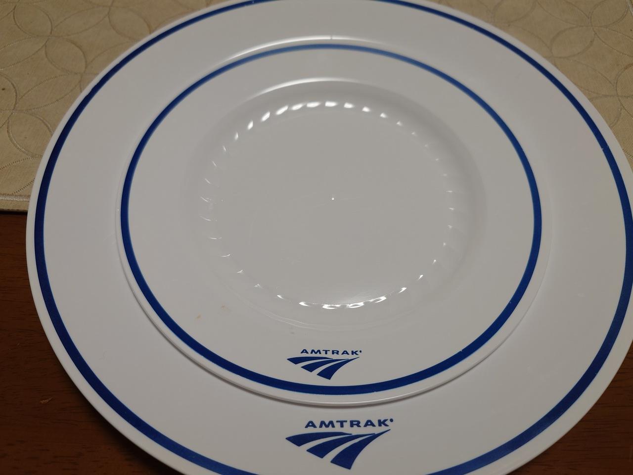 アムトラック車内で提供される部屋用の食器、一見 ちゃんとした皿のように見えますが 、ペラペラのプラスチックです。合計3回の食事があったので大きい皿は3枚とも持って帰りました(笑)