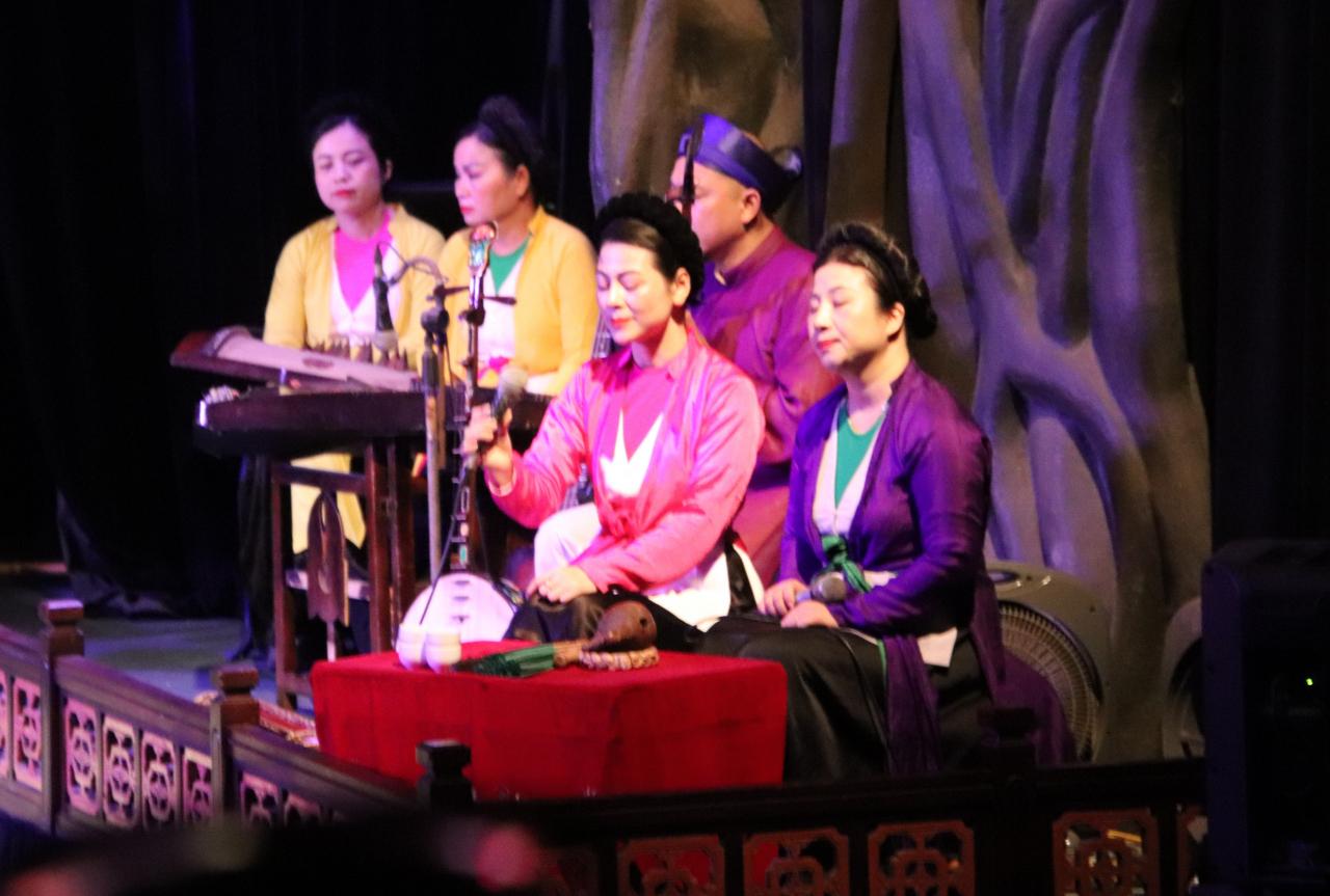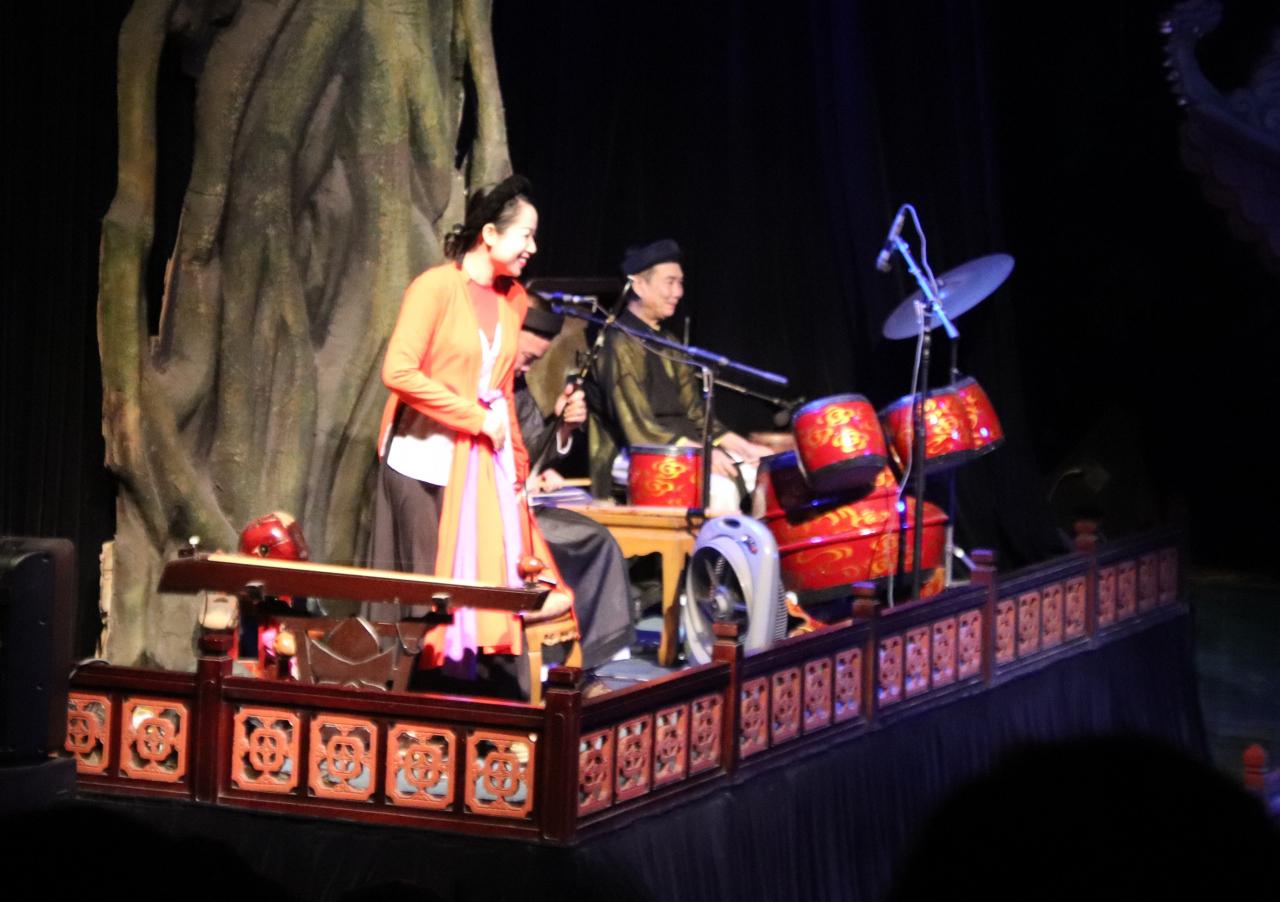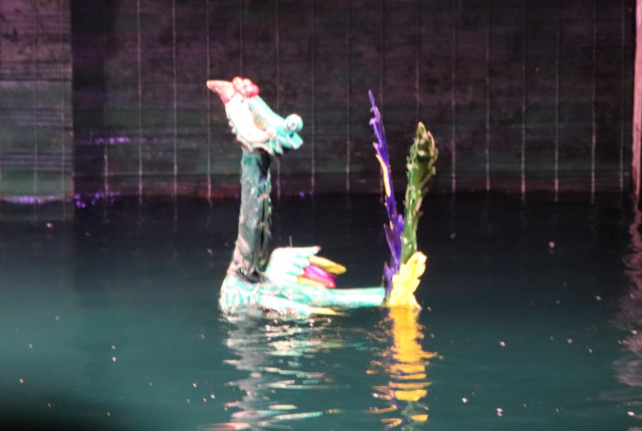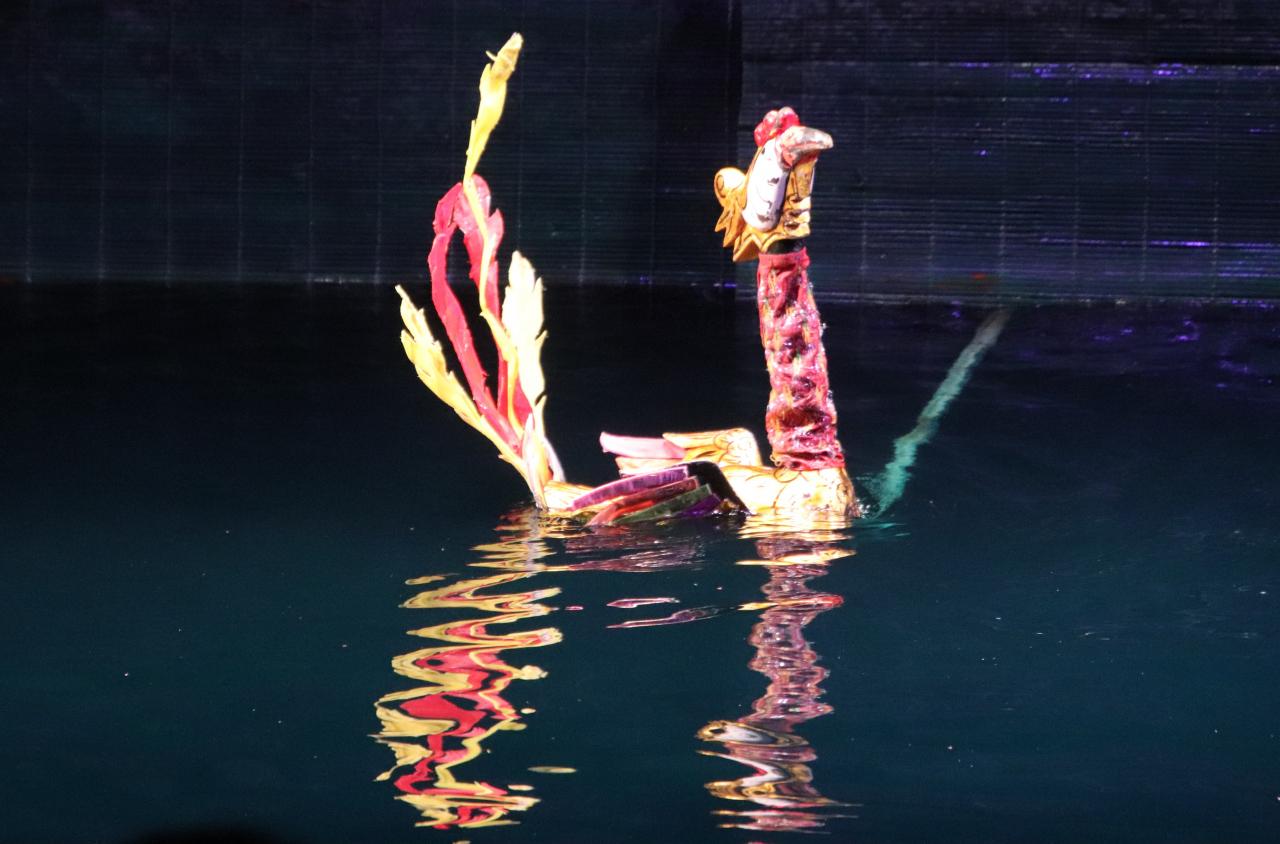 客席の前に水を張ったプールのような舞台があり、その奥に幕があります。幕の後ろに人形遣いが立ち、水の中に仕込まれた棒や仕掛けで人形を動かします。伝統楽器の生演奏と歌に合わせて、人形が水の上を滑るように動いたり、水しぶきを上げたりして、とても躍動感のあるステージになります。