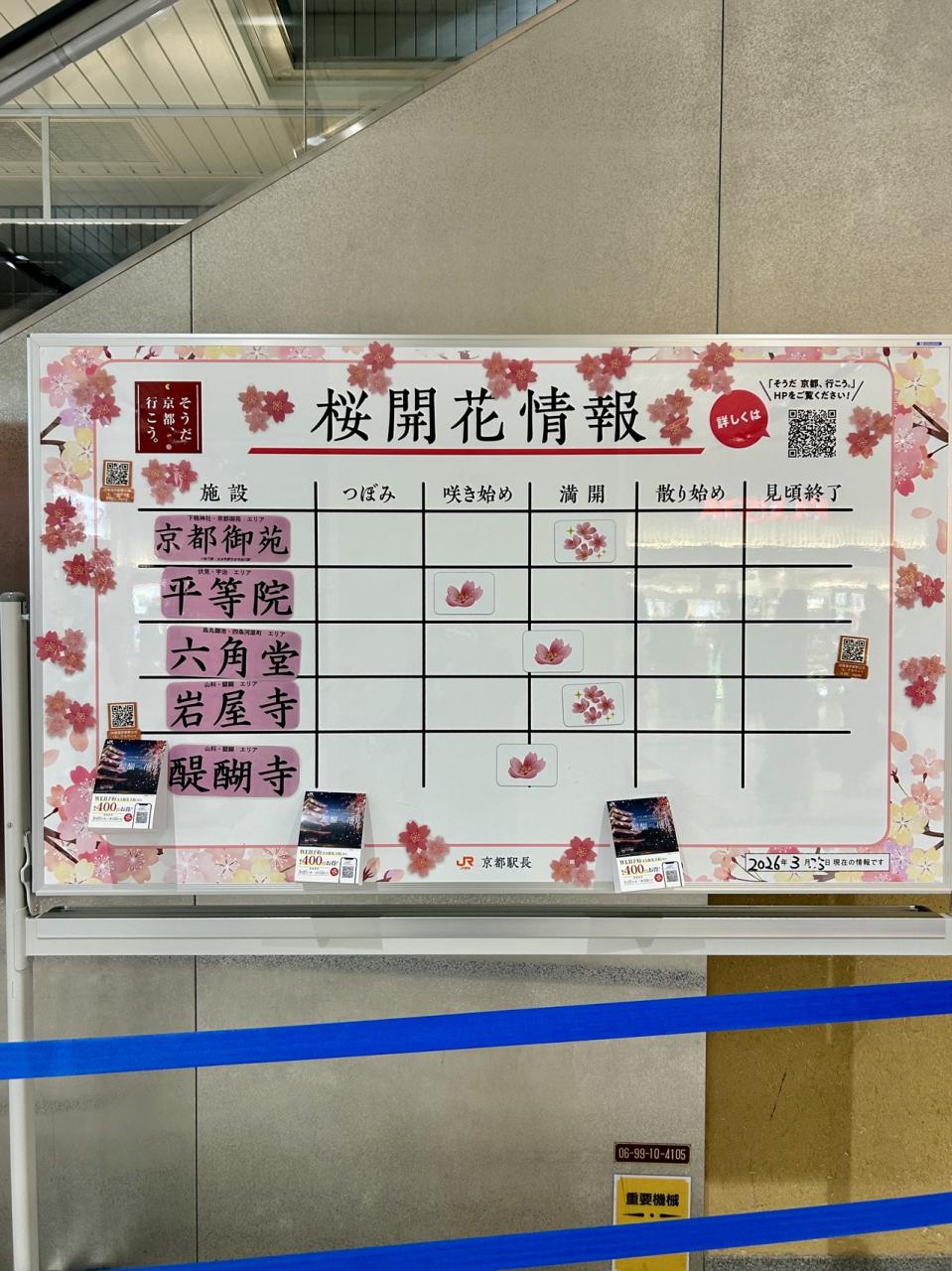 京都は珍しく3月中に桜がほぼ満開、新幹線のコンコースには桜開花情報の掲示がありました。京都新幹線 コンコース 市場・商店街
