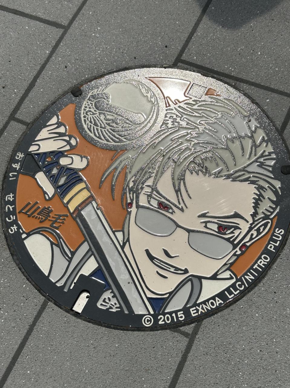 こちらは名だたる刀たちが人の体を得て、歴史改変を目論む時間遡行軍と戦うゲーム、刀剣乱舞のキャラクター、本日のメイン、国宝 山鳥毛さんのマンホール。