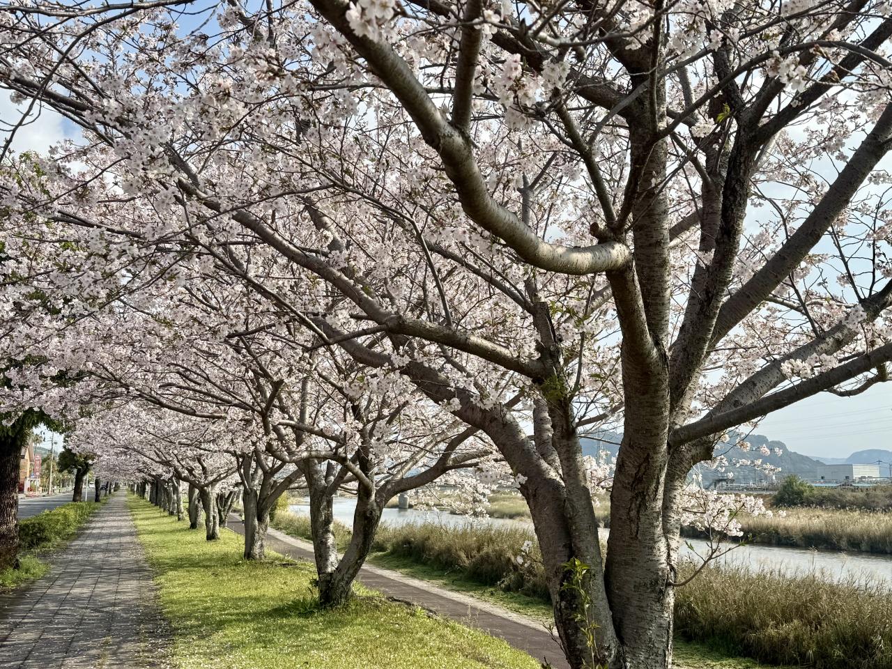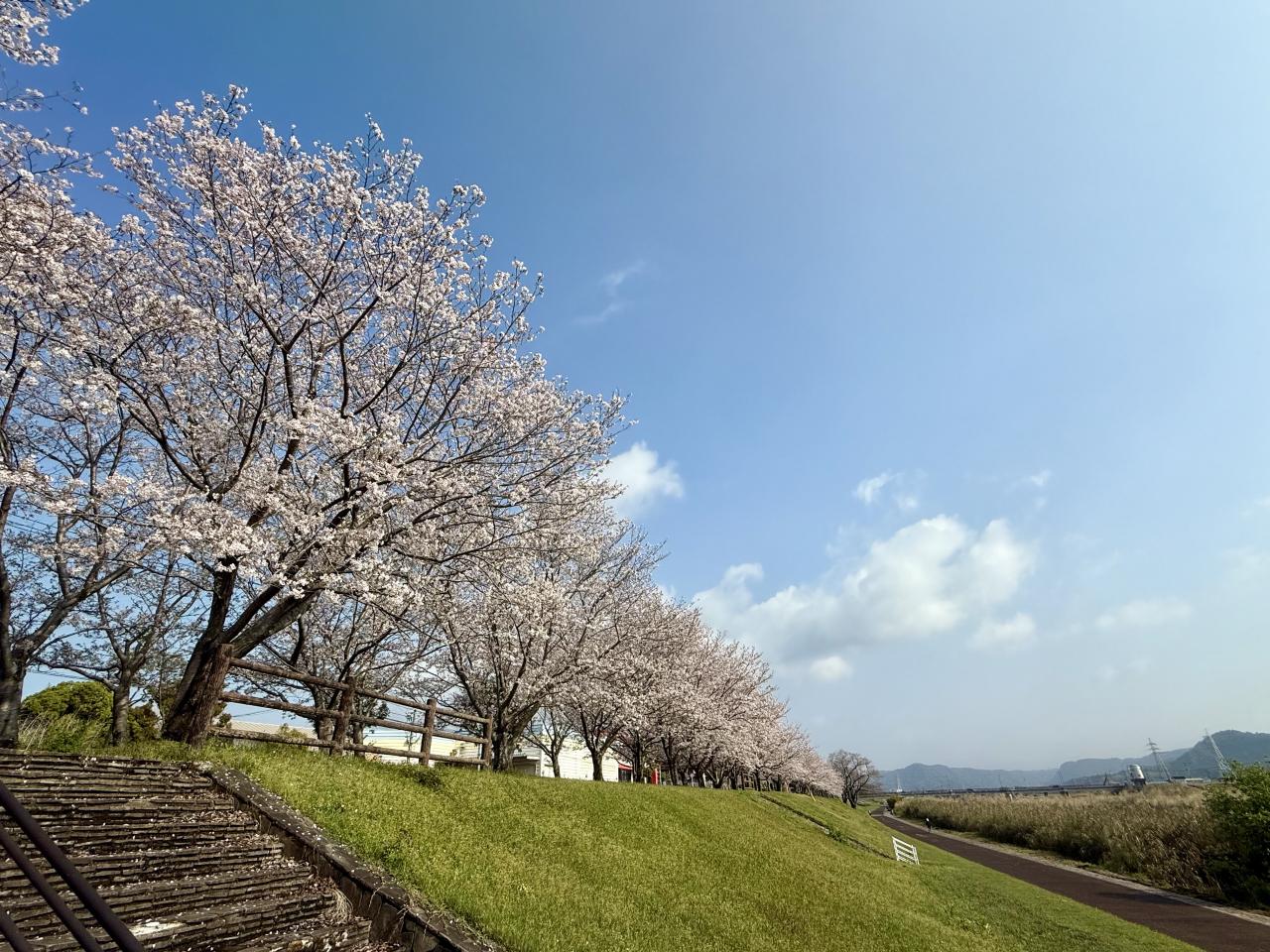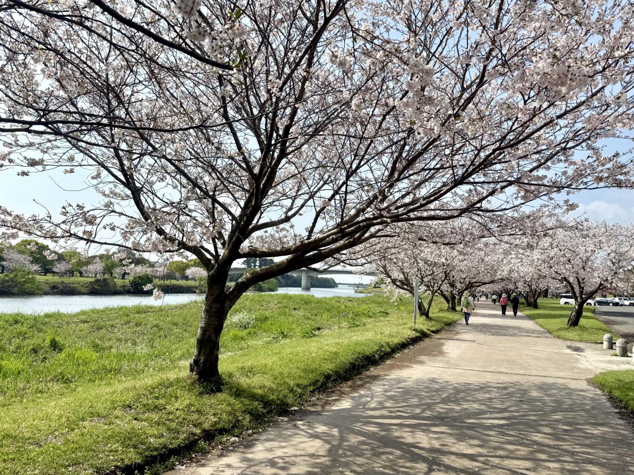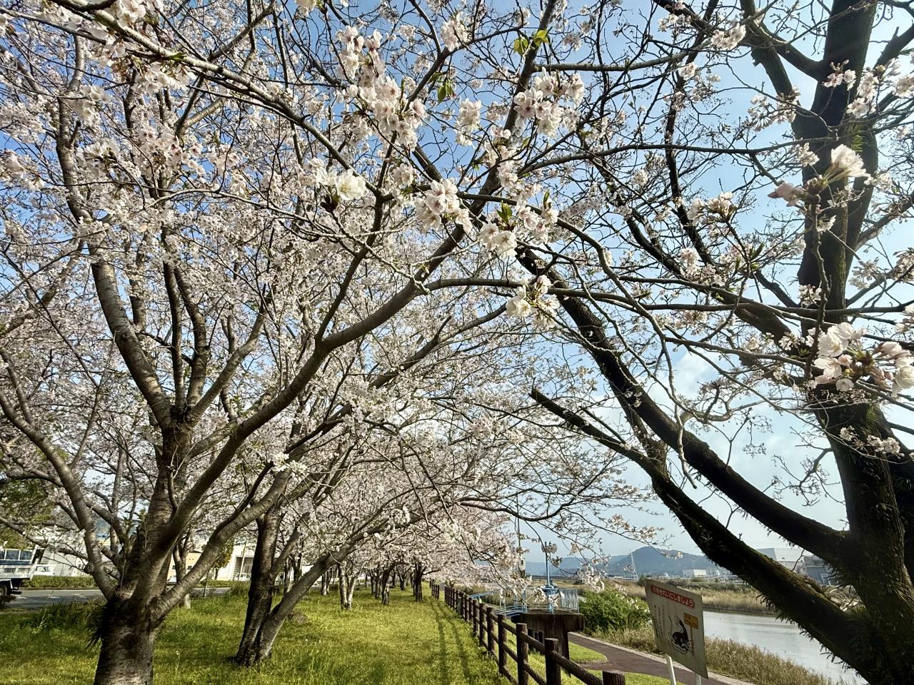 4月2日、霧島市「天降川ふるさとの川河川公園」、野口橋下西側の駐車場にとめて京セラホテル側に歩きましたが、北側まで一斉に満開していました、日本語変やろ。