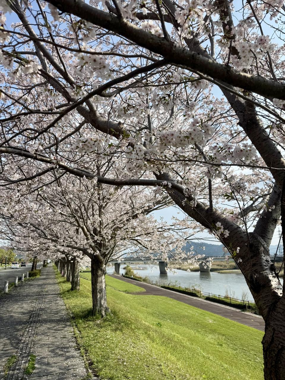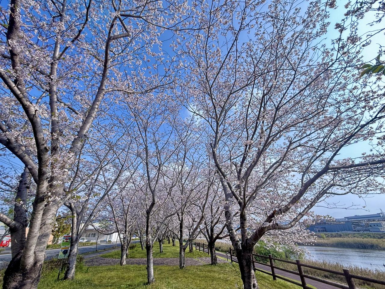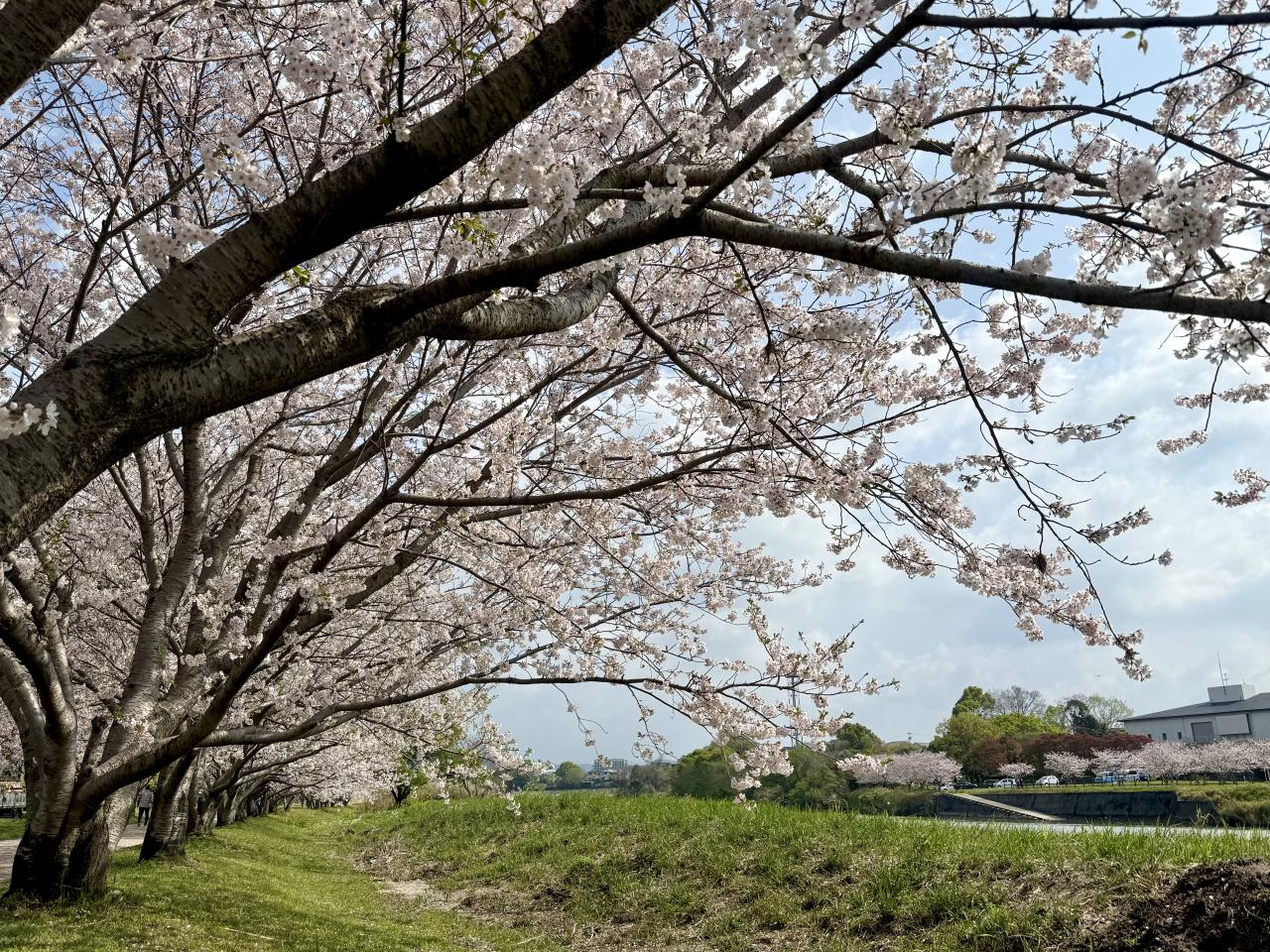 4月2日、霧島市「天降川ふるさとの川河川公園」、野口橋下西側の駐車場にとめて京セラホテル側に歩きましたが、北側まで一斉に満開していました、日本語変やろ。