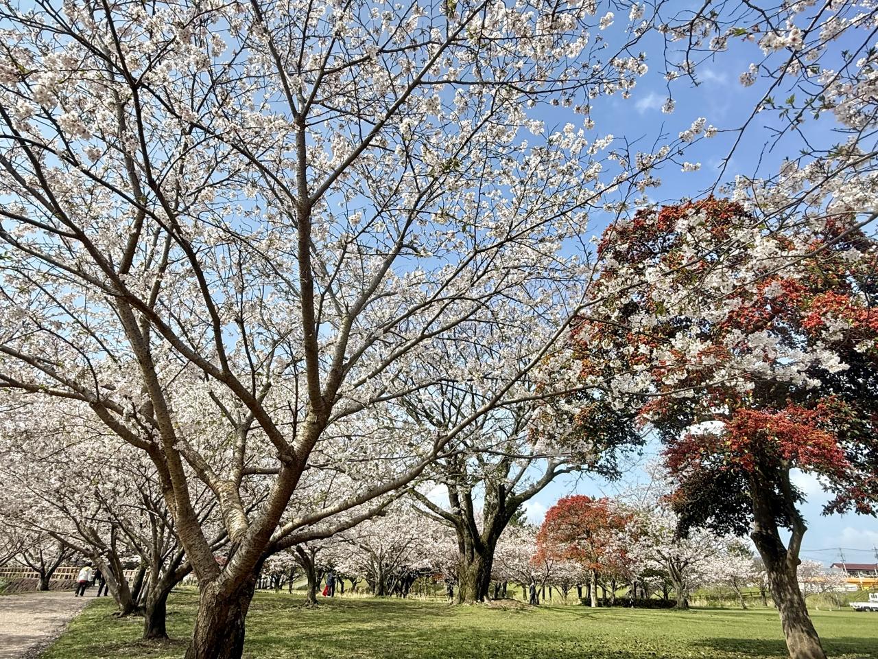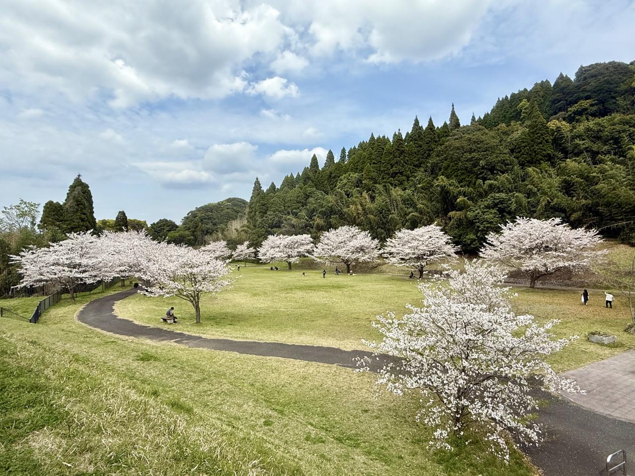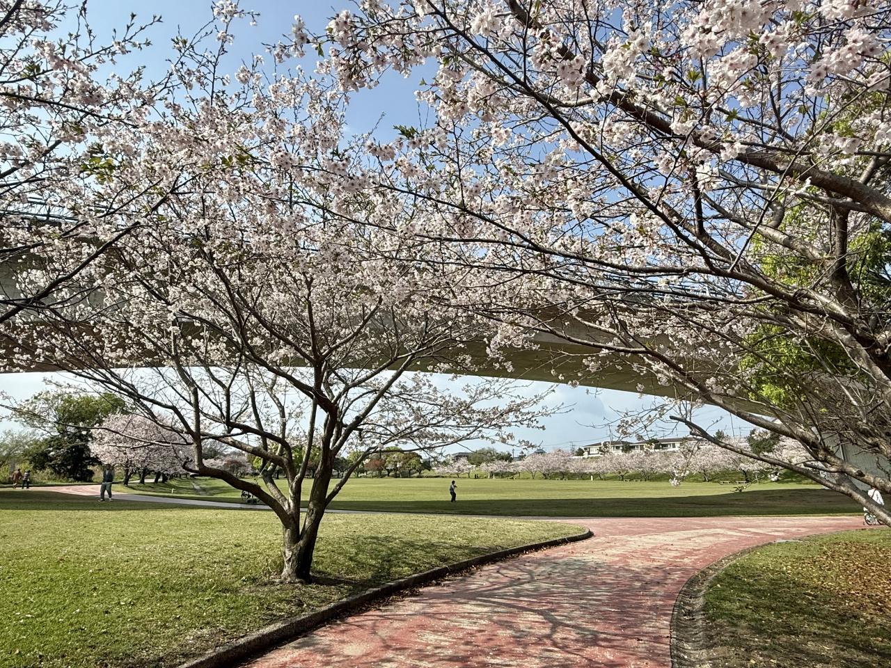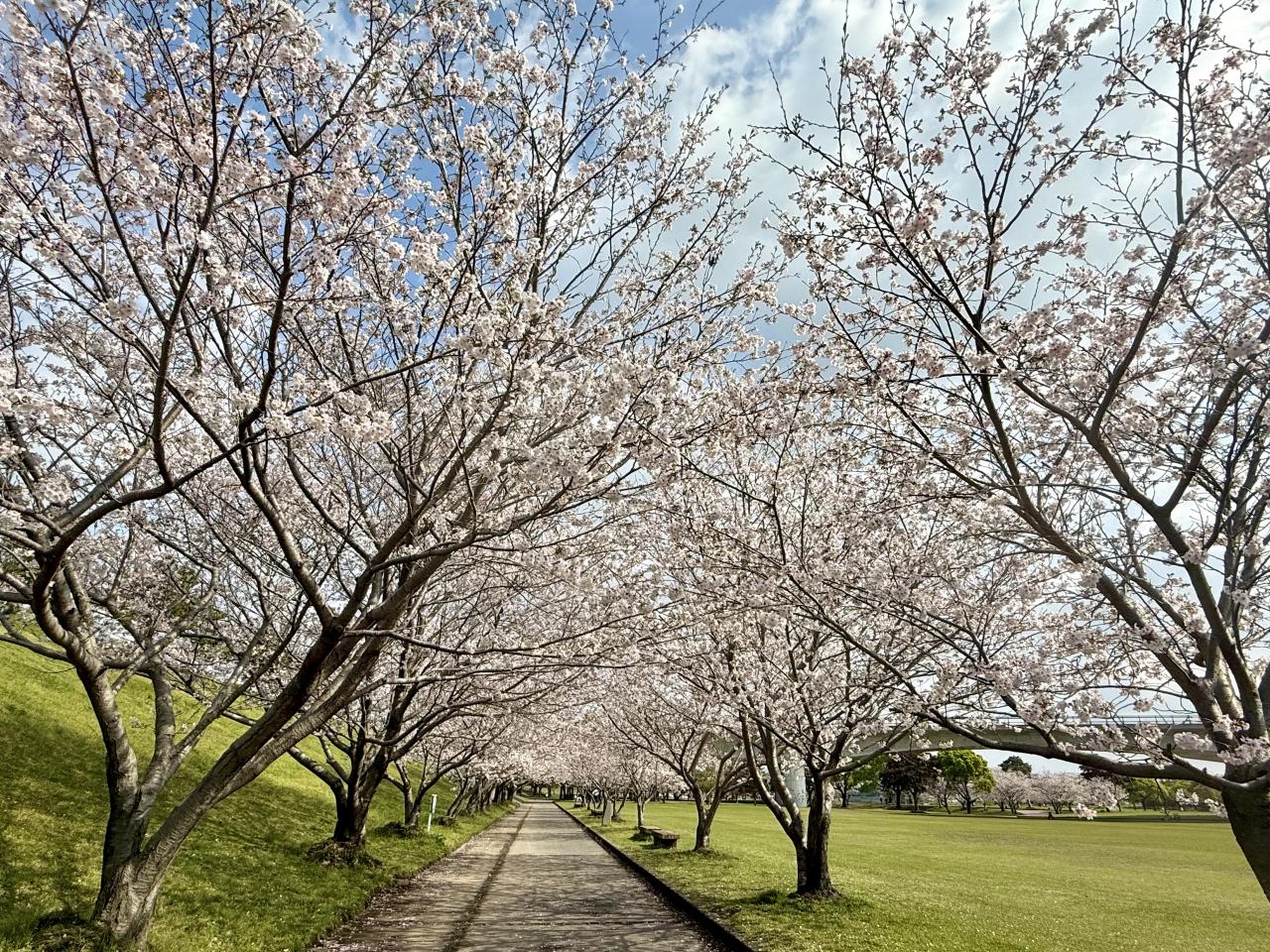 4月2日、霧島市「天降川ふるさとの川河川公園」、野口橋下西側の駐車場にとめて京セラホテル側に歩きましたが、北側まで一斉に満開していました、日本語変やろ。