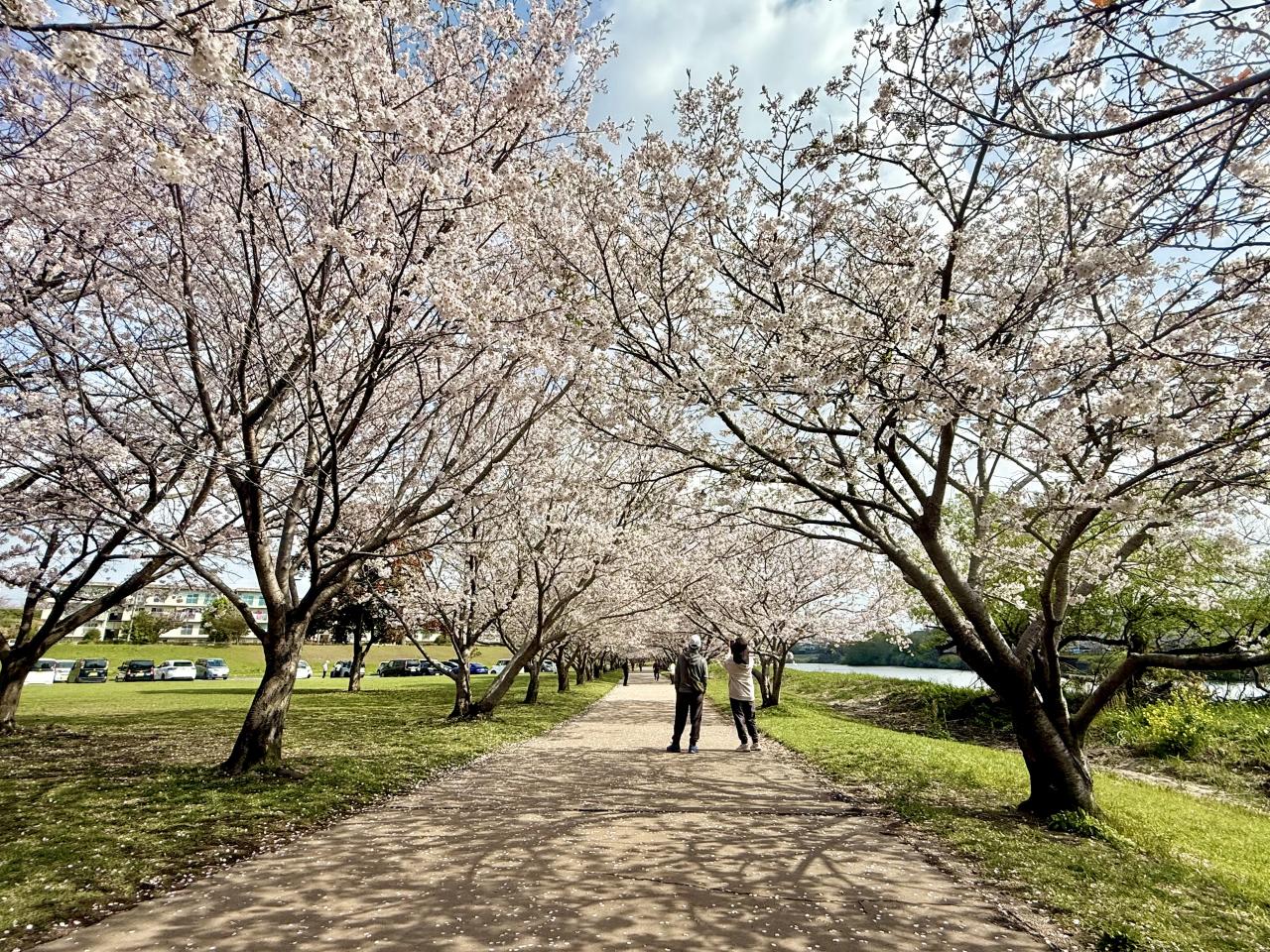 駐車場から近い川沿いの桜並木は人気スポット