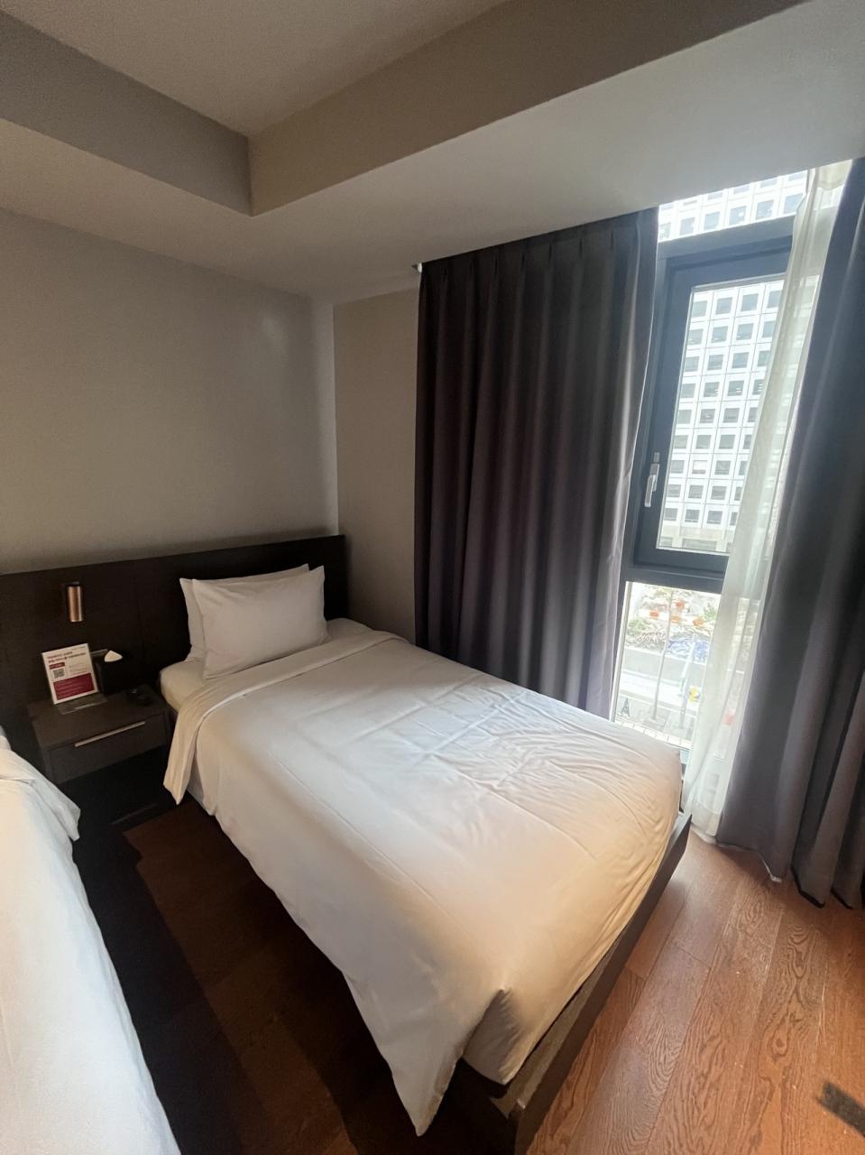 初日に撮ったお部屋。壁掛けTVは大きいですが、地上波の映し方がよく分からず、YouTubeばかり観てました。毎日お水の補充あり、タオルももちろん交換。金庫もありました。