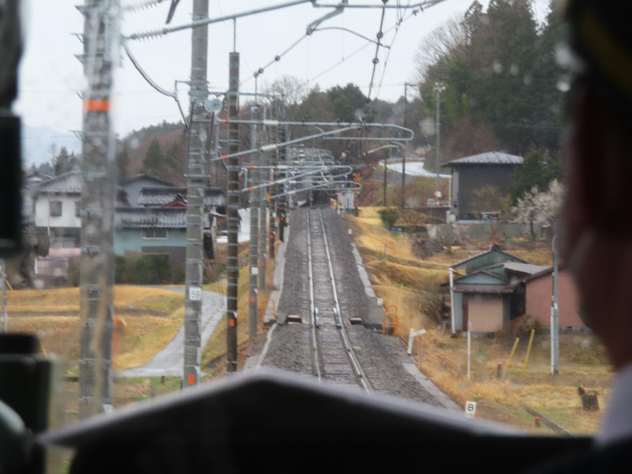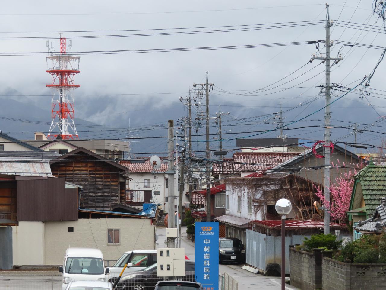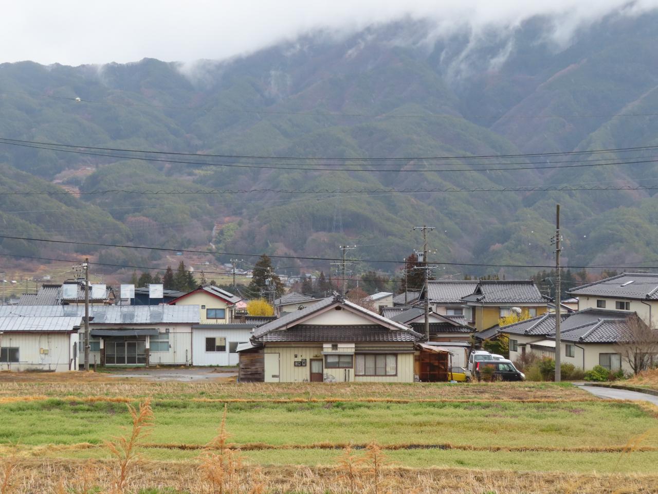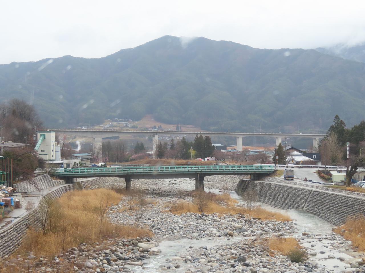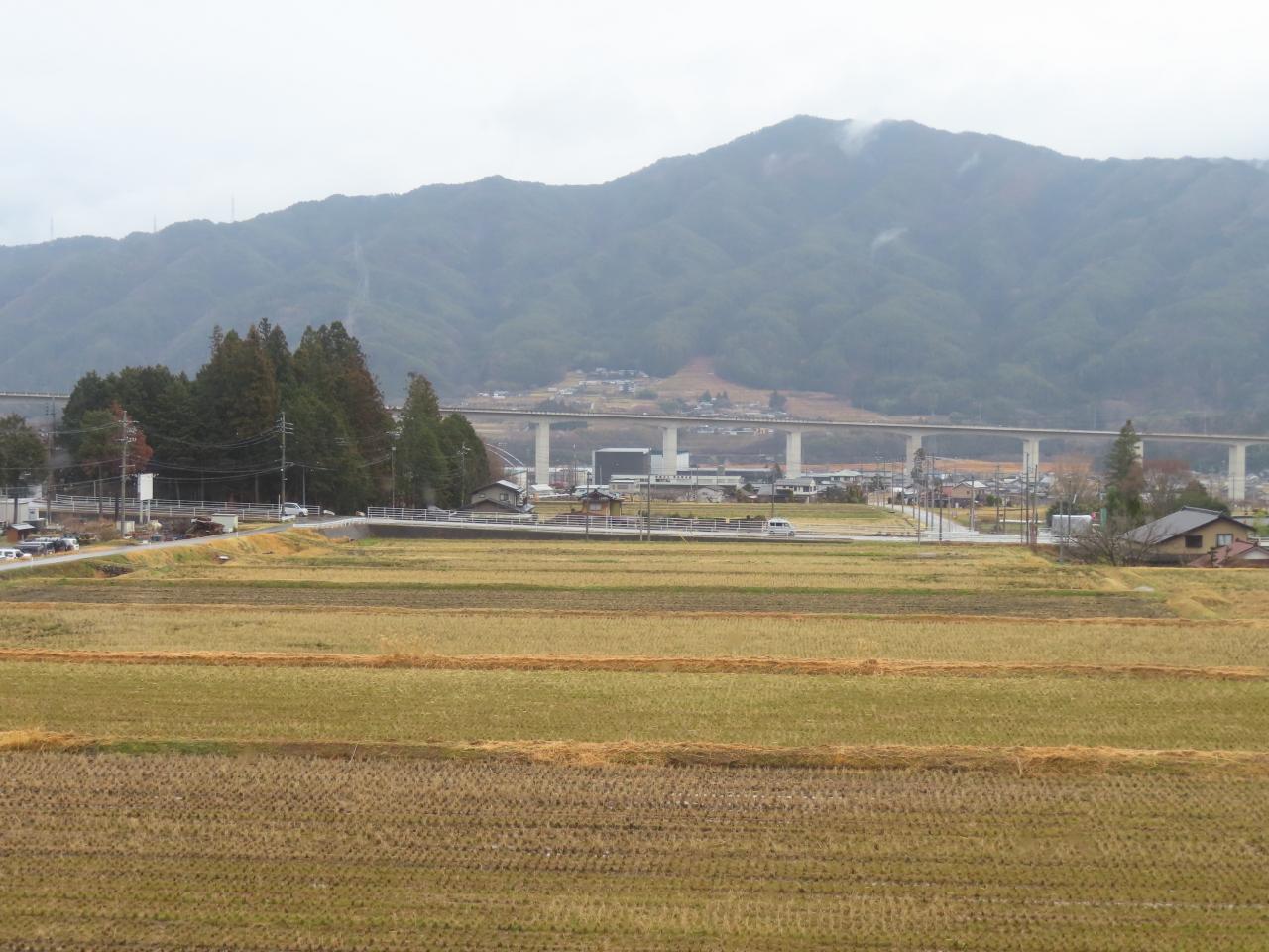07:49「明科駅」近く。あいにくの天気です。美しい早春の北アルプス連邦は拝めませんでした。