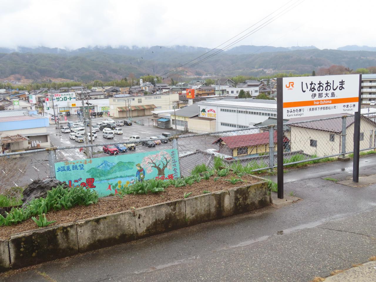 10:46「伊那大島駅」河岸段丘という地形なのでしょうか、川から一段高い所にありました。