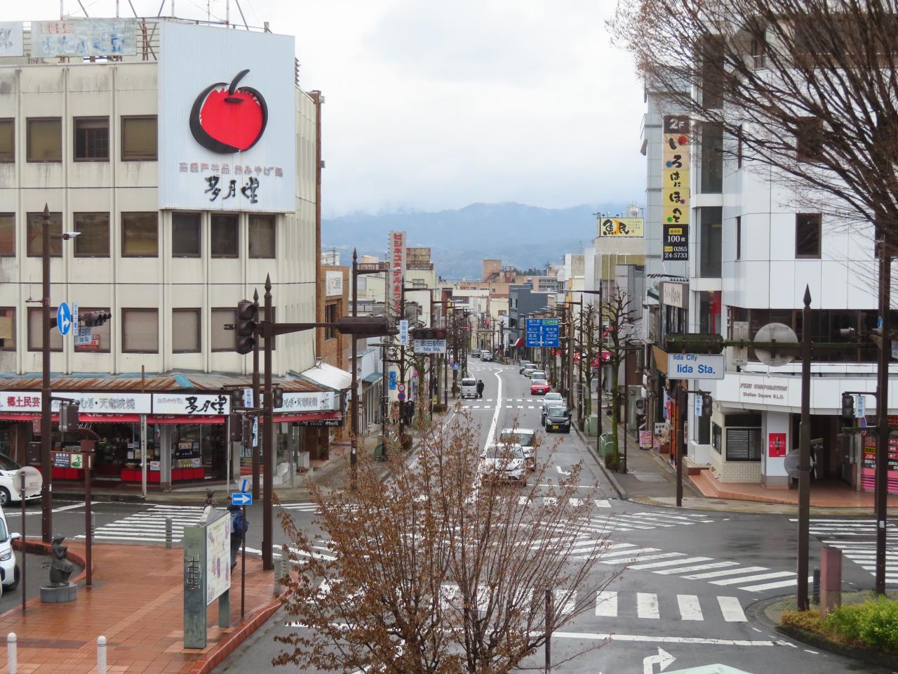 跨線橋から見た駅前の通り。大きなリンゴの看板がかわいい。