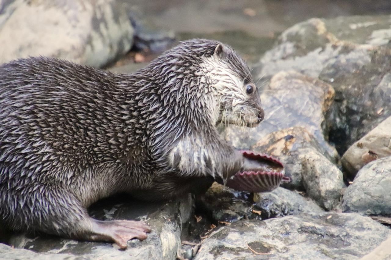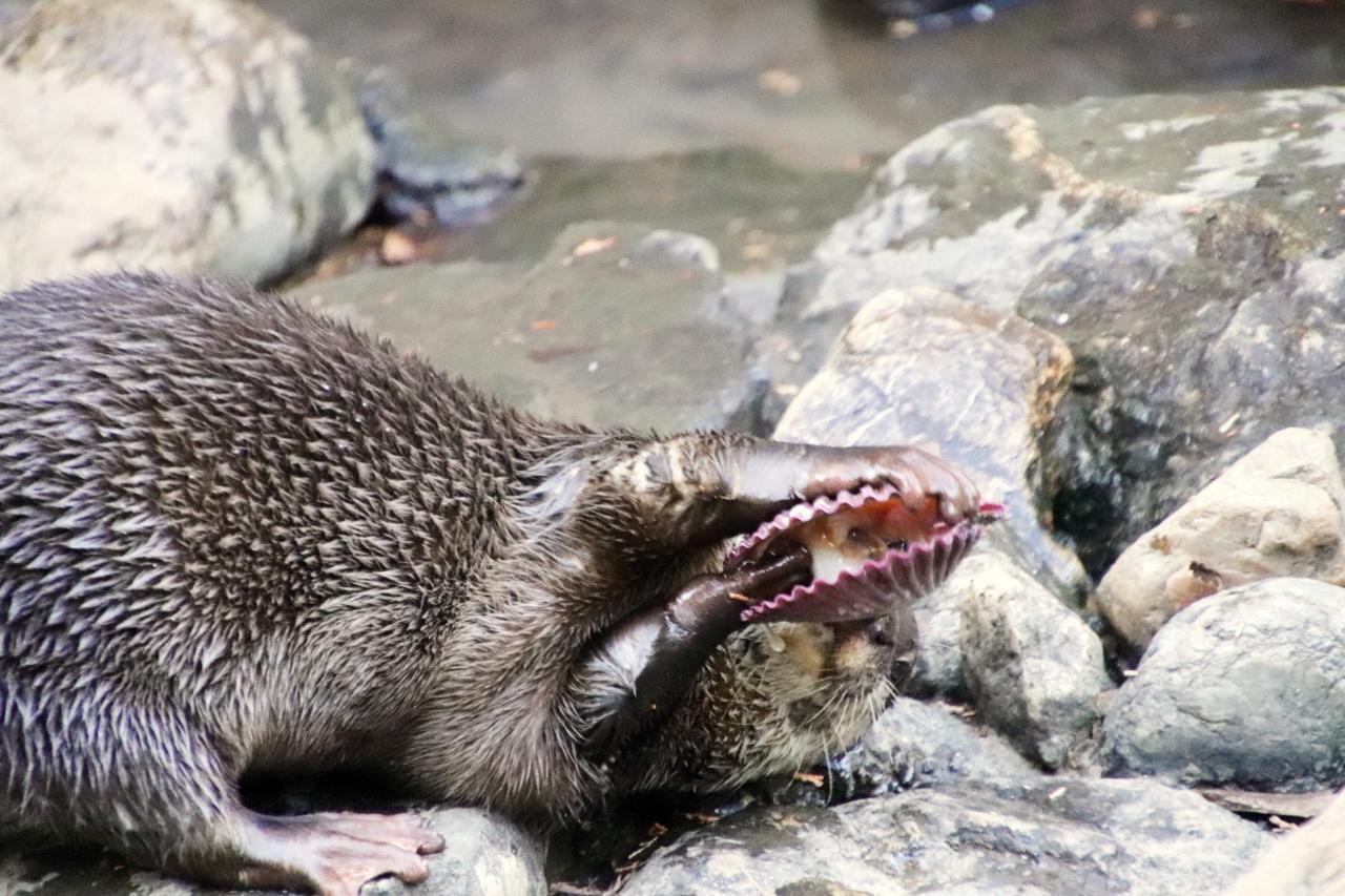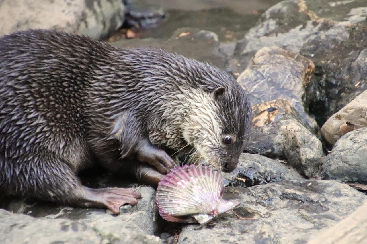 ヒオウギ貝を食べようと奮闘するコツメカワウソたちの中で、貝はまさに扇のように映えていました。