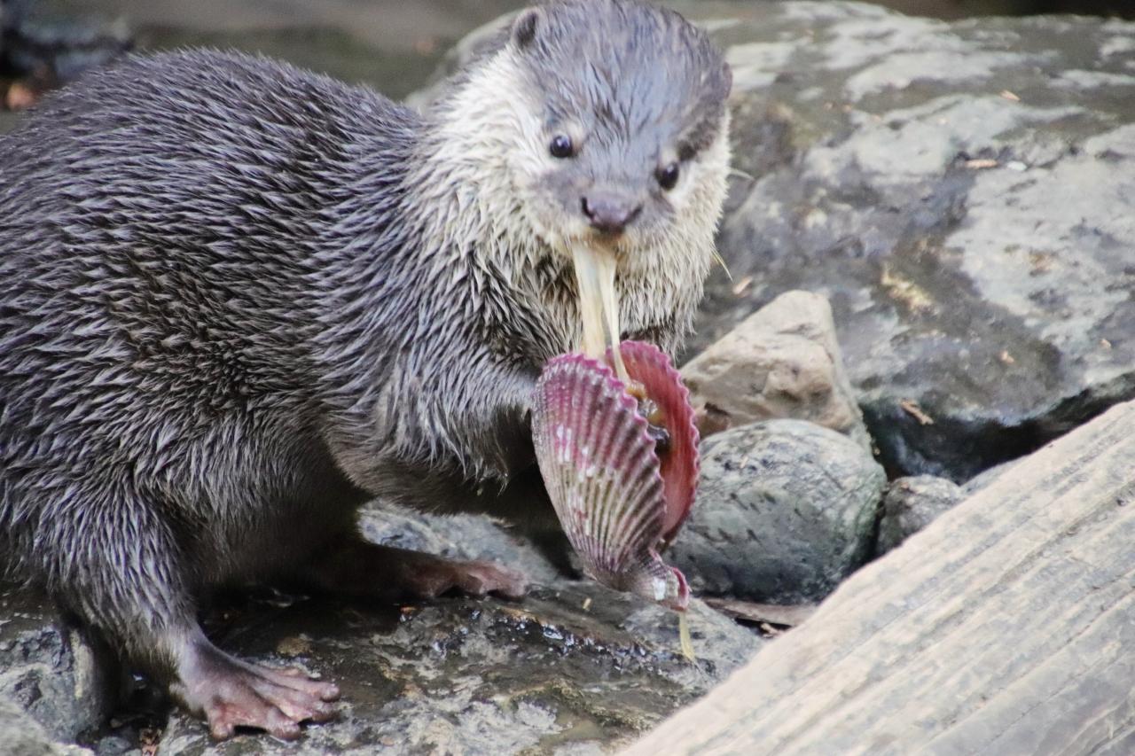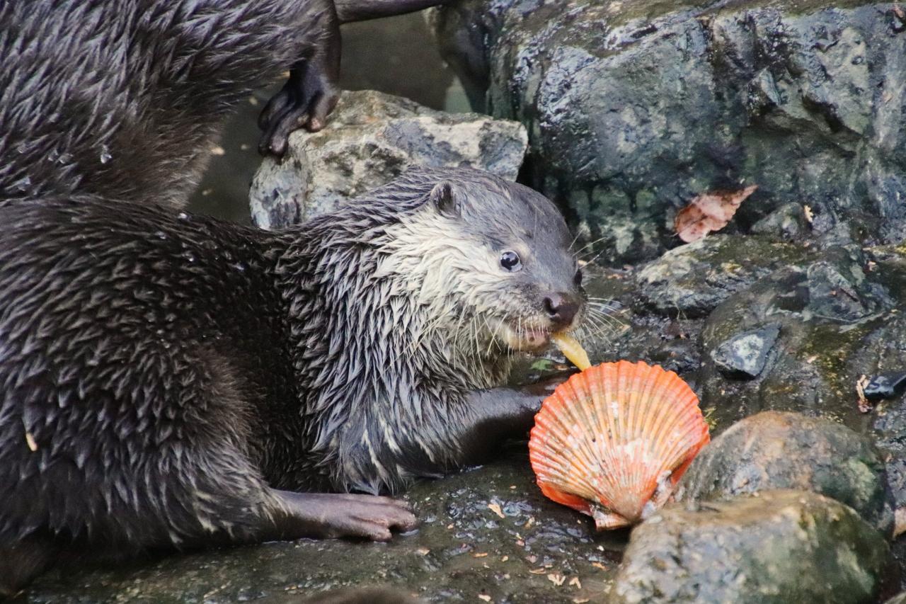 でも代わりといってはなんですが、この日のコツメカワウソのむしゃむしゃタイムでは、近所のコストコさんからの差し入れが、赤とオレンジの実に色鮮やかなヒオウギ(桧扇)貝だったのは、幸運でした!