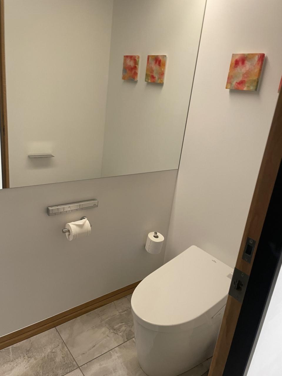 上がりかまちのところに備え付けの使い捨てのスリッパが置いてあったので、土間のお手洗いに行く際に使ってねという意味合は受け取ったけど、リビング部分と離れているのはちょっとだけ不便かも。