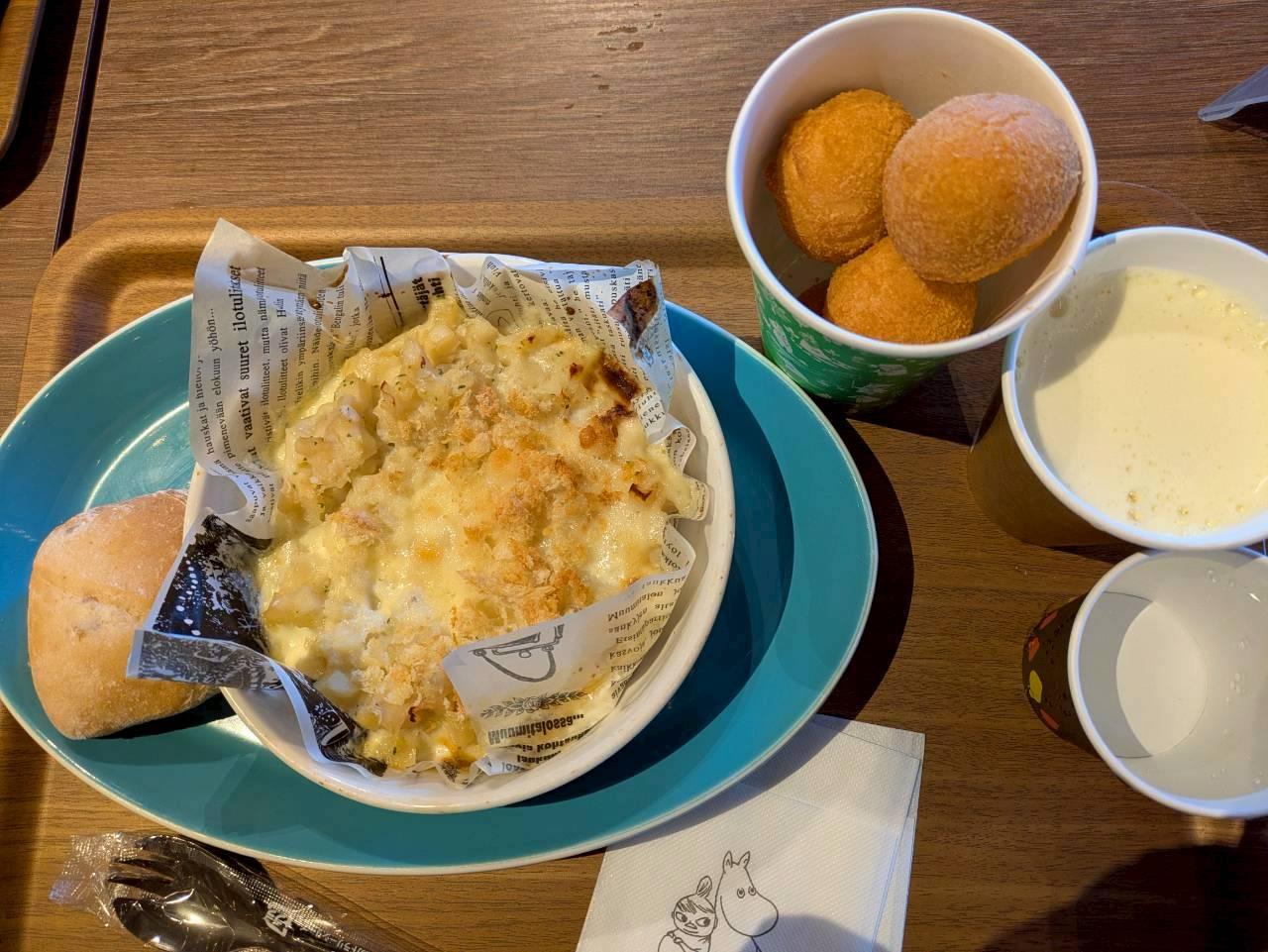 チーズボールとヤンソンさんの誘惑というポテト、アンチョビ、玉ねぎをホワイトソースをかけて焼いた北欧伝統料理。