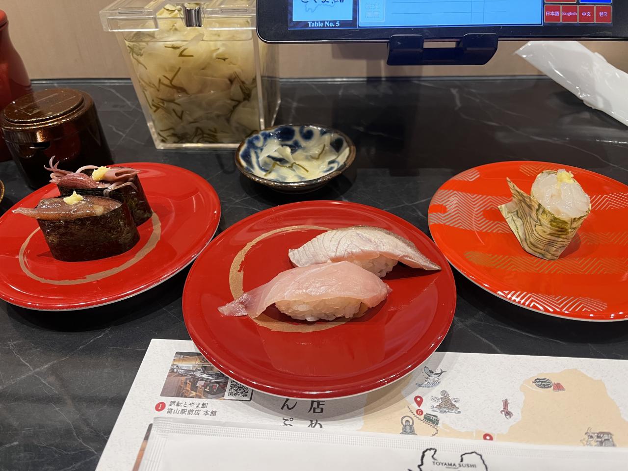 廻転とやま鮨。土曜日の昼、本館で26組待ち、念のために新館に行ったら10組待ち。新館で40分ほど待って入店できました。