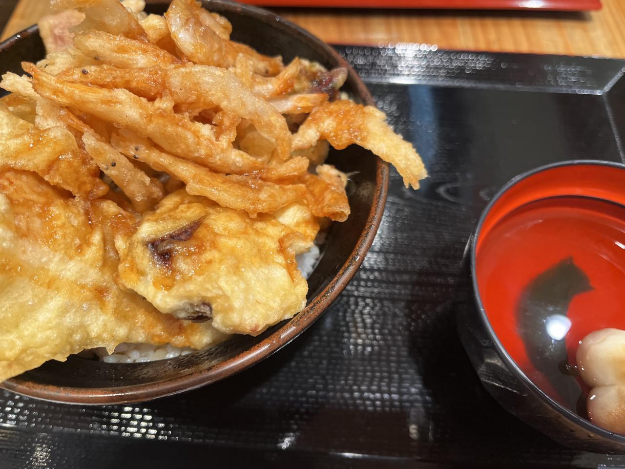 ホタルイカと鰤と白エビの天丼。ボリュームたっぷり。新幹線の時間に間に合いそうになくなり容器をもらって持ち帰ってホテルで食べました。