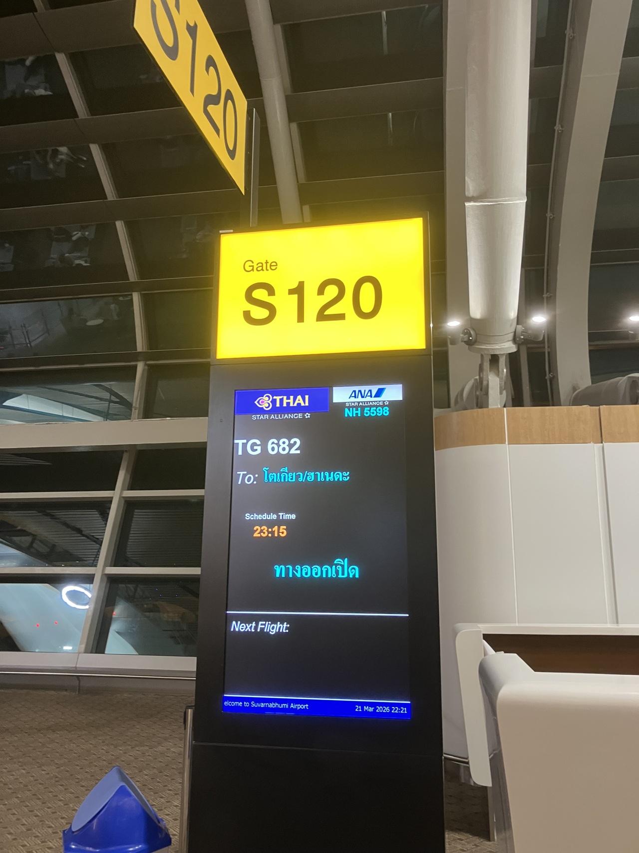 21(土)スワンナプーム空港・タイ航空(23:15)→22日(日)6:55 羽田空港
