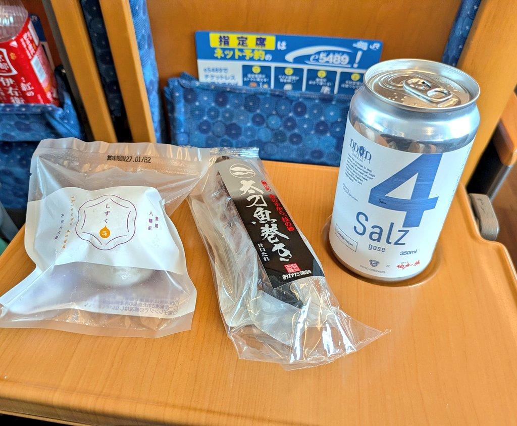 空港で買った太刀魚巻きとみかん大福、だんだん通りで買った伯方の塩コラボビールで小腹を満たす。