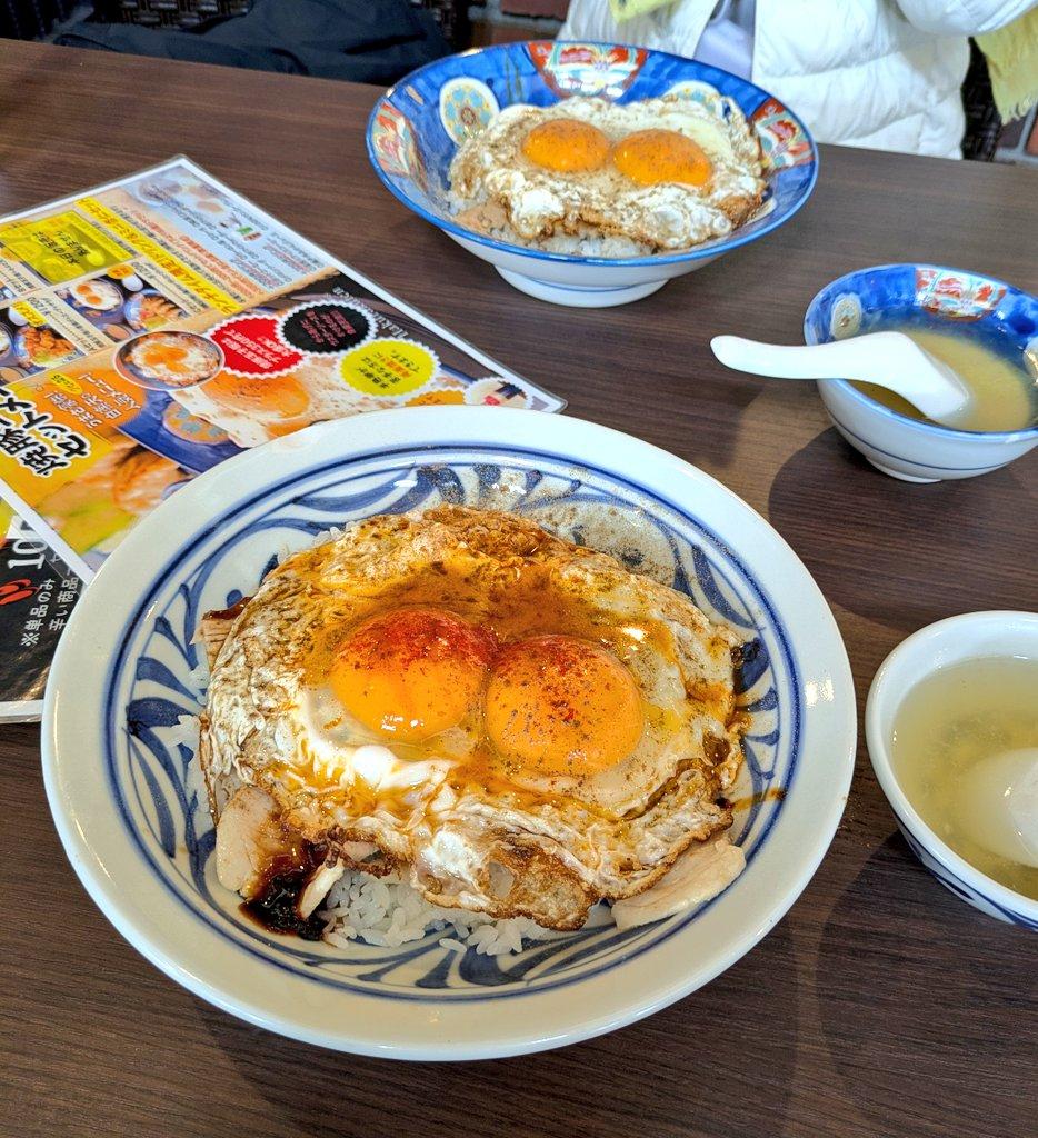 焼豚玉子飯。ノーマルと辛いバージョン。腹一杯。