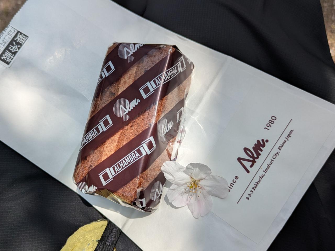 森見公園で桜を見ながら、食後のデザートに「スイス菓子アルム」で買ったアルハンブラを頂く。スイス菓子のアルム グルメ・レストラン