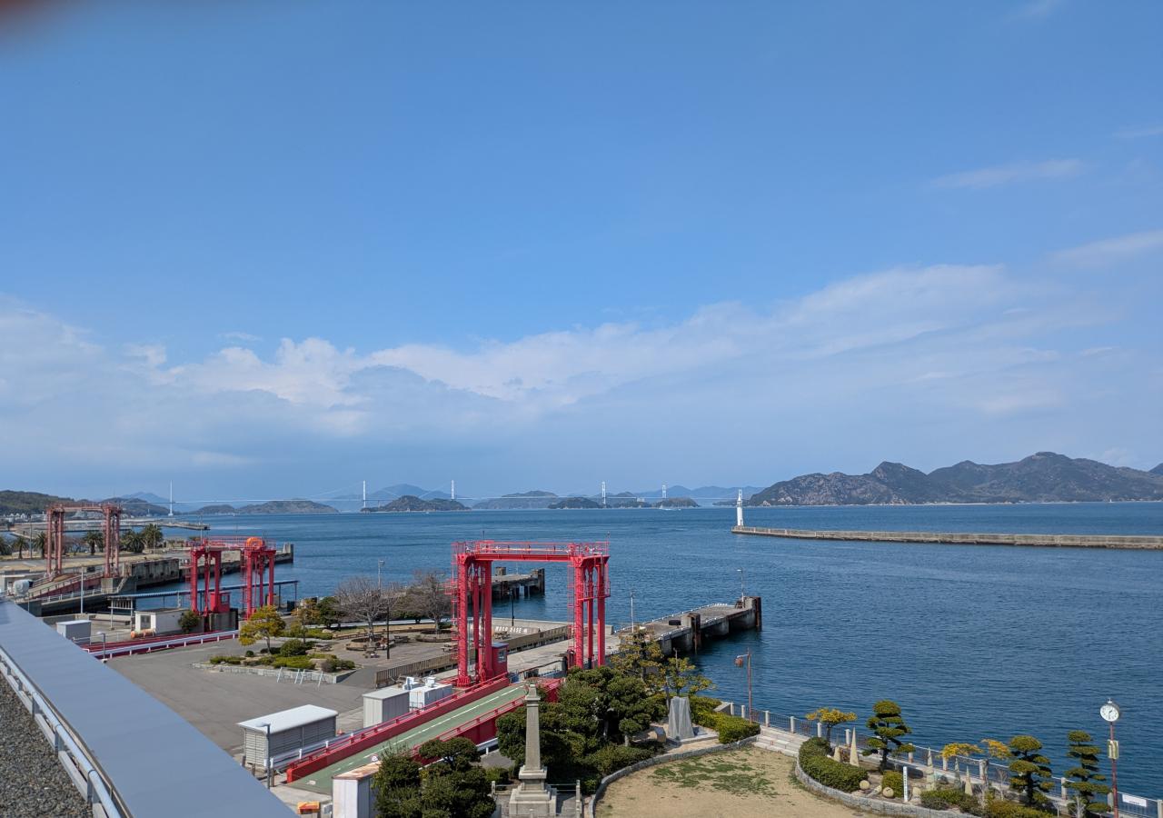 みなと交流センターの屋上から来島海峡大橋を望む。