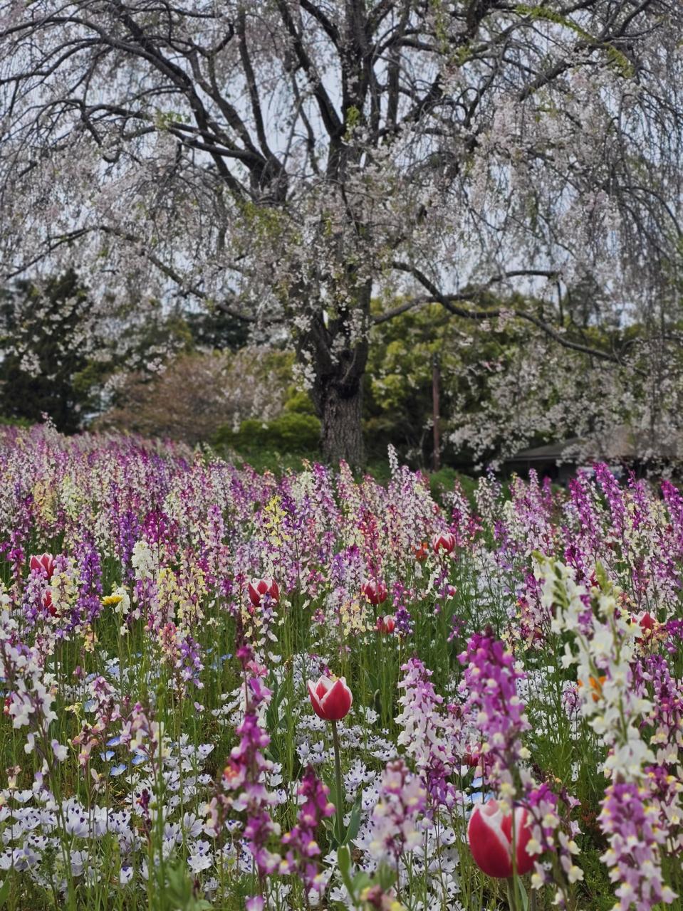 ブーケガーデンでは垂れ桜の下にルピナスなどが咲いていた。