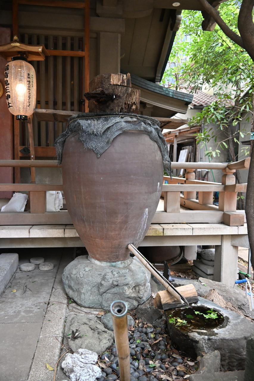 社殿の屋根から雨水を大きな甕に溜め、少しずつ水琴窟に注いでいます。