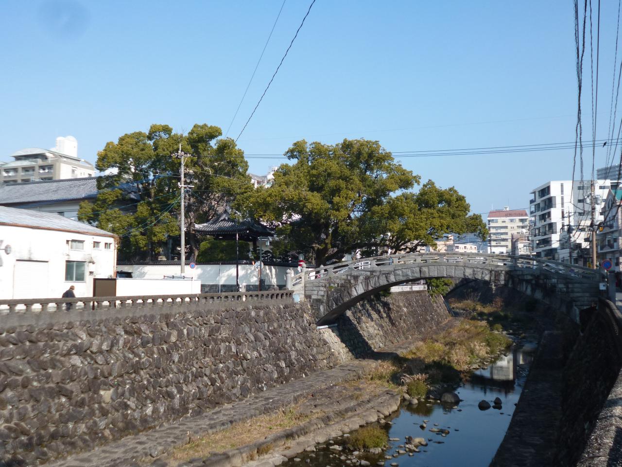 名前の由来はいろいろあるようですが、この橋から見下ろすと中島川沿いの橋や町並が一望できたことからつけられたともいわれています。