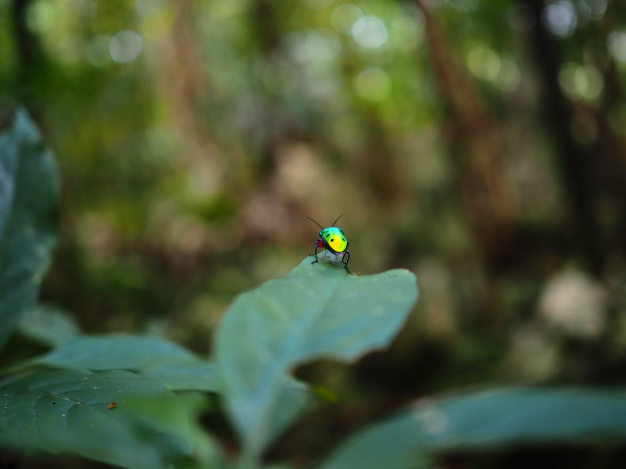 今にも飛び立ちそうな、玉虫色の甲虫(変な言い方だけど)が飛び立つところをカメラに収めようとするも、飛びそうで飛ばず。