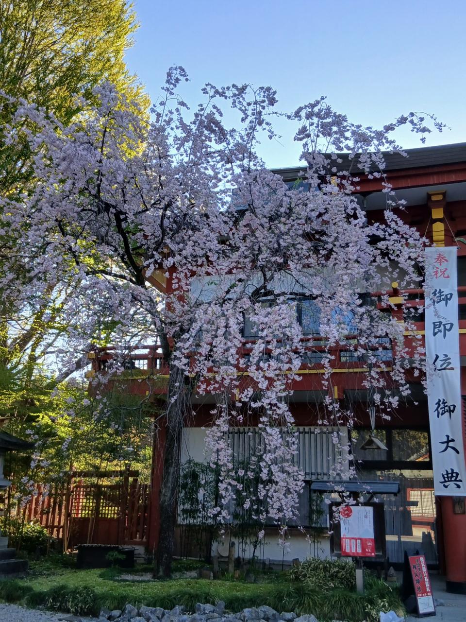 社務所前のしだれ桜は満開
