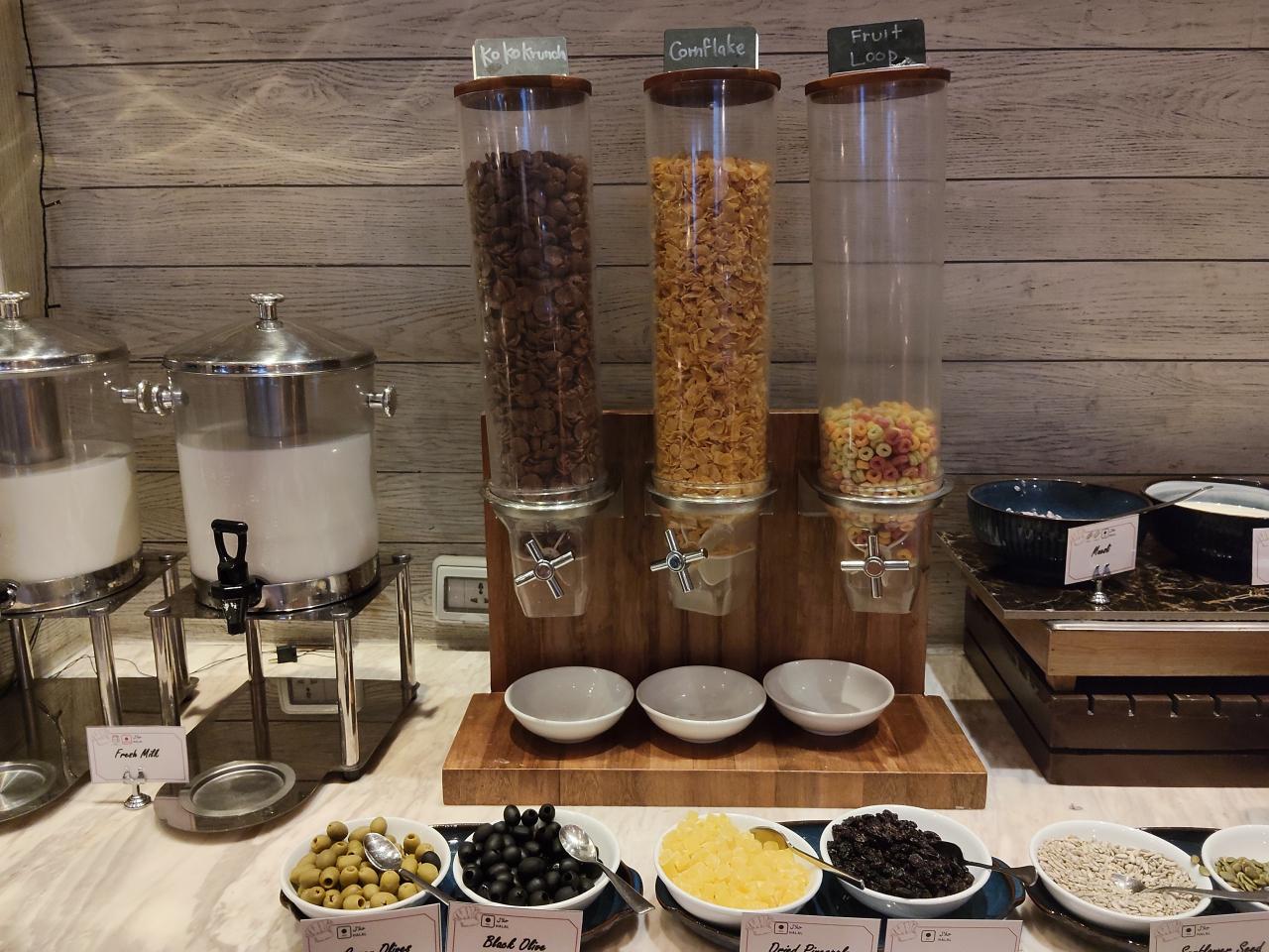 コーンフレーク、牛乳、ドライフルーツ、オリーブ。