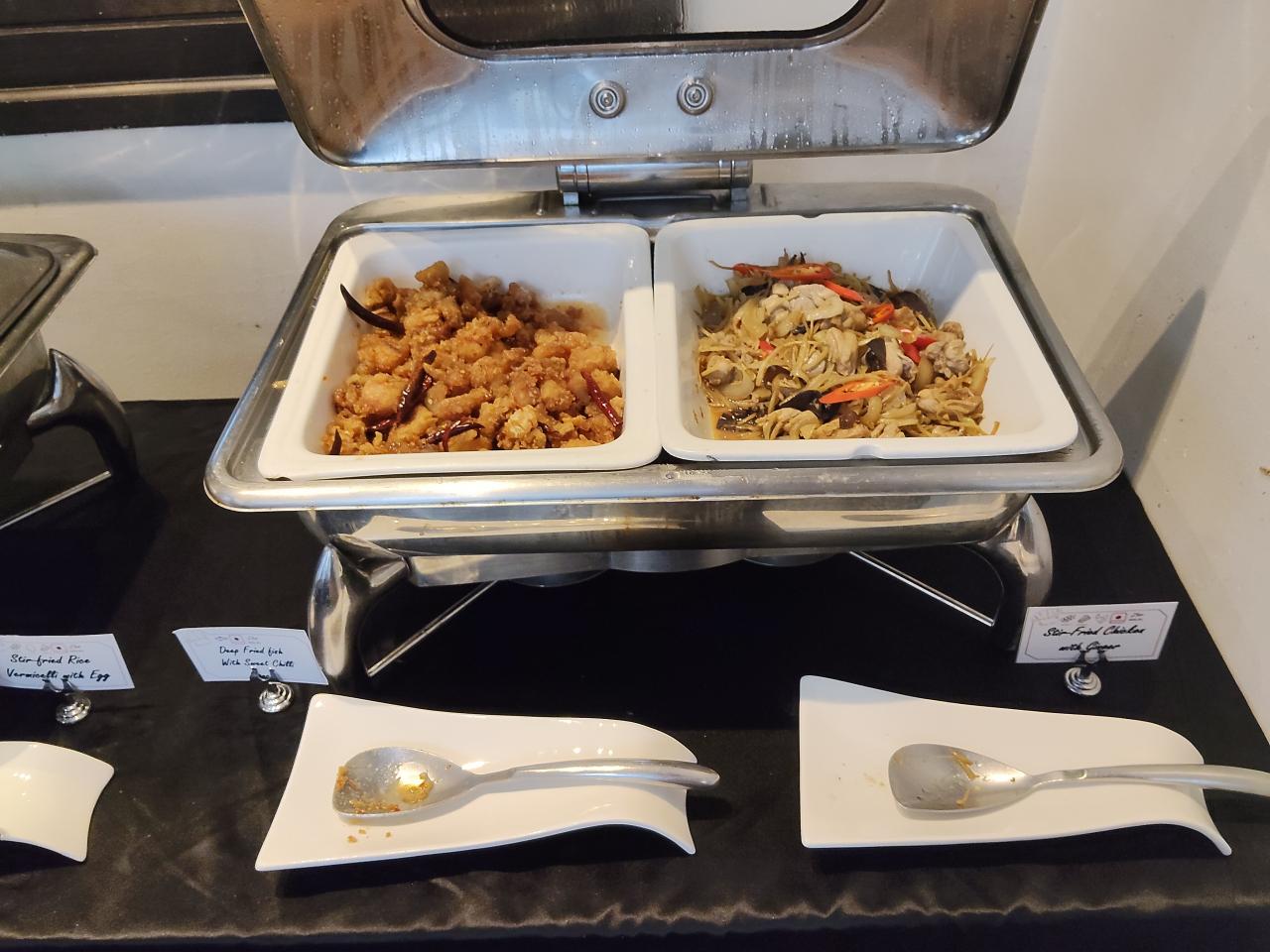 鶏肉と生姜炒めと魚の揚げ物チリソース和えといったところでしょうか。