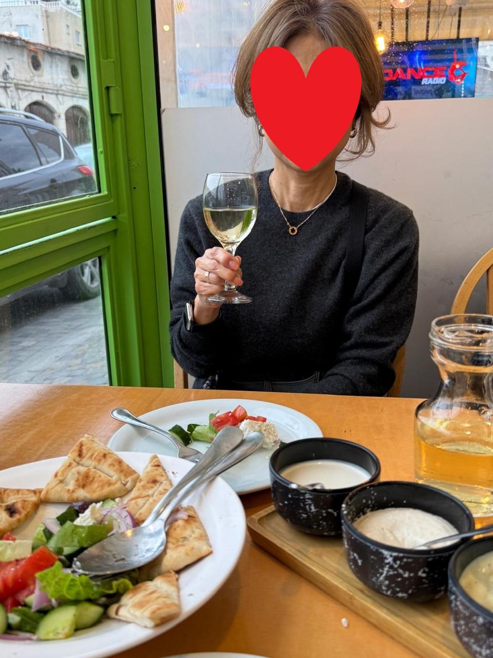 2名用のシーフードセット40ユーロにしたら大きなグリークサラダも付いてきました。ワインは300ml 4eur 500ml 6eur 1000ml 11eur だったので当然1000mlかと思ったら夫が1Lなんて飲めないよ~と言うので500にしましたが当然足りなく、もう500を頼んだけど12eurになるので1eur損・笑
