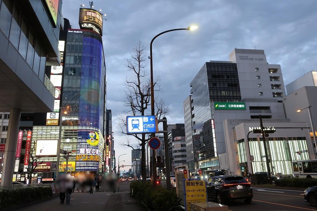 三越を後に、元の交差点方面。ドンキが目立っていますね。
