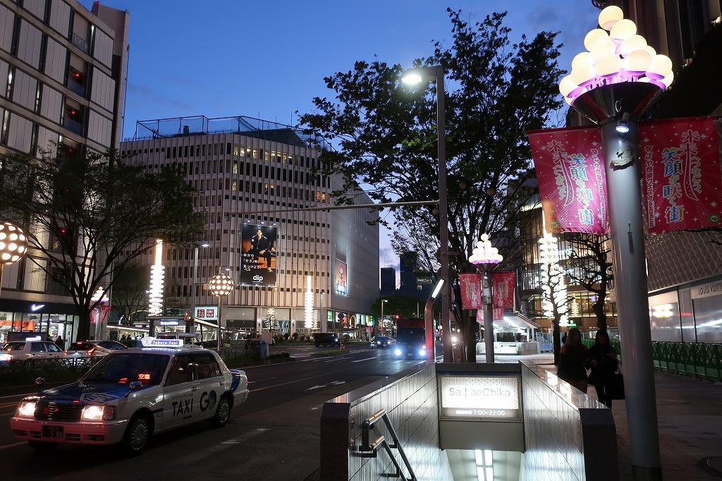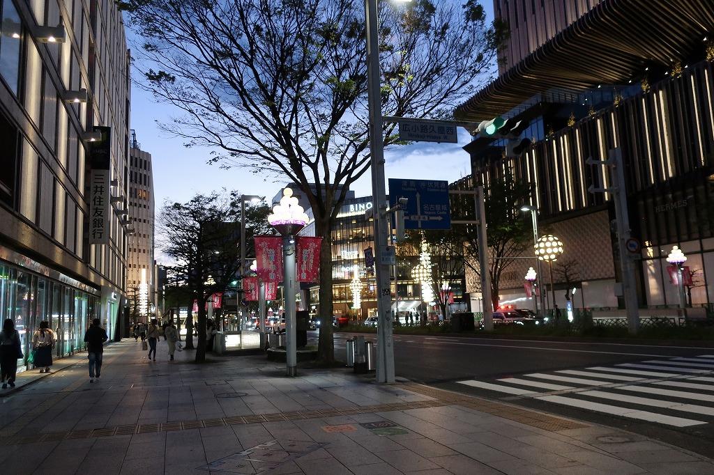 腹ごなしに栄をウロウロ。夕闇がきれいですね。