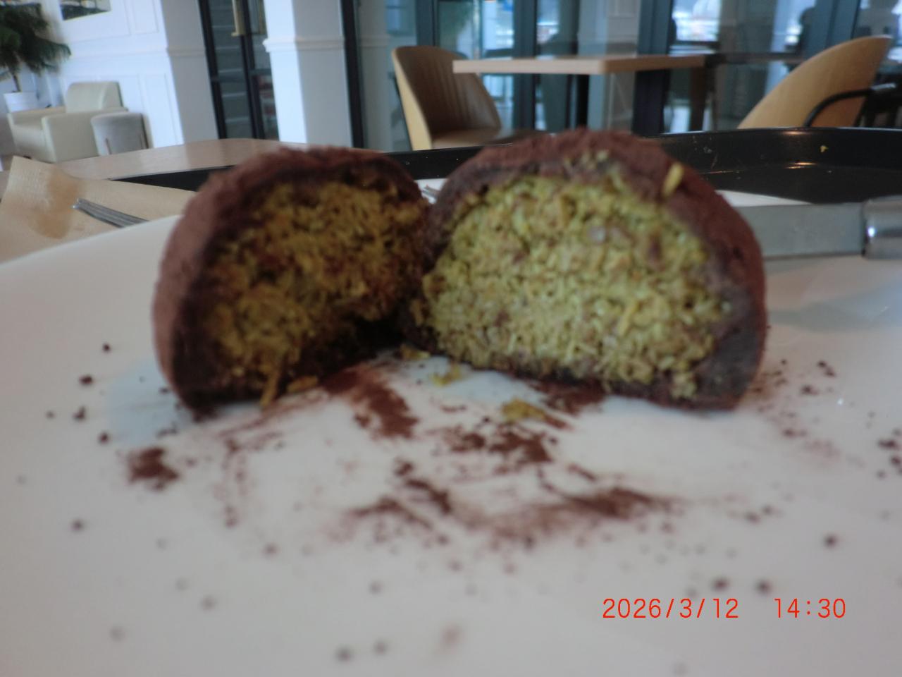 サクサクした食感の濃厚ピスタチオのカダイフをもちもちの餅で包んで、チョコの粉で覆いつくしたデザート。