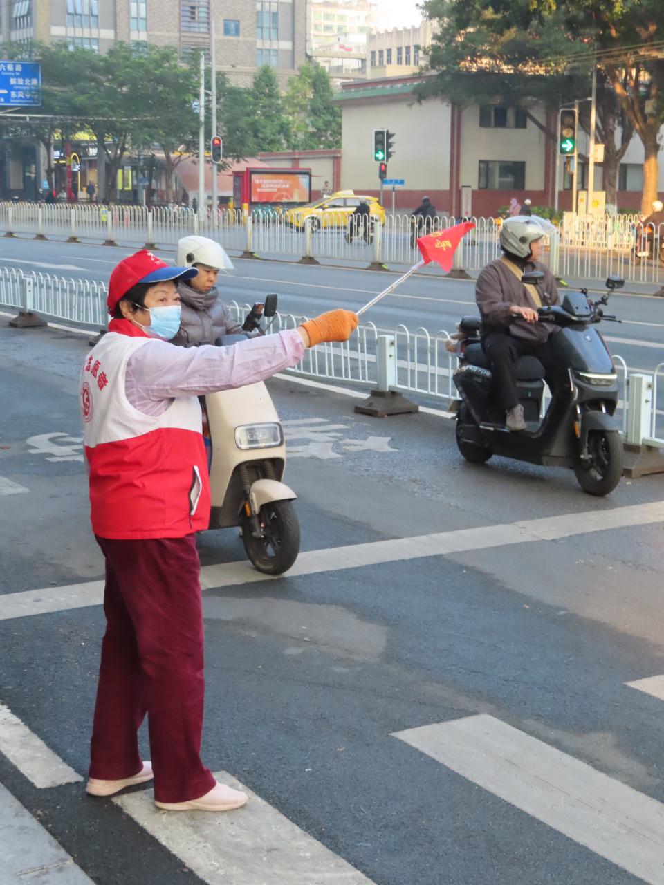 公園の外では朝のラッシュの交通整理が。