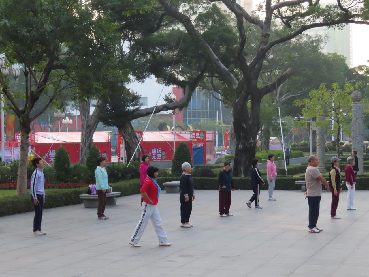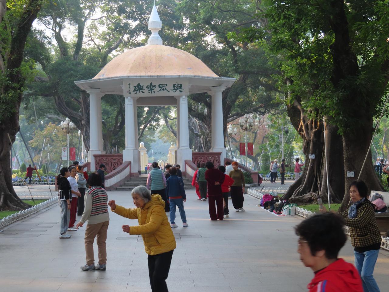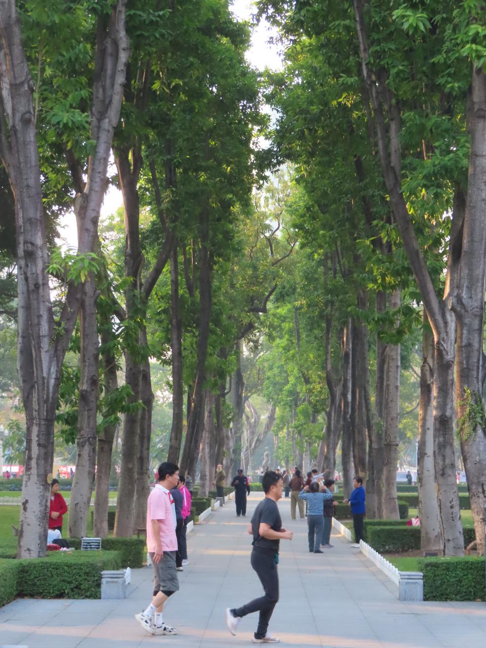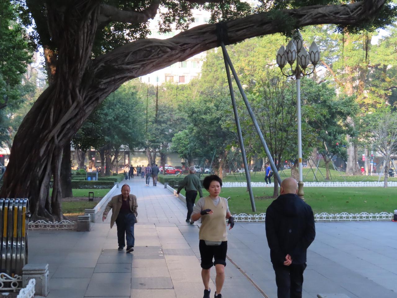 この日は平日の朝ですが、散歩する人、ジョギングする人、太極拳をする人、さまざまな朝の日常が垣間見れました。