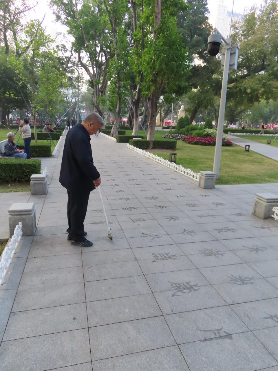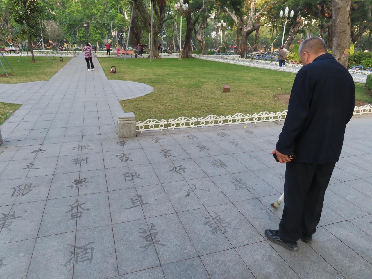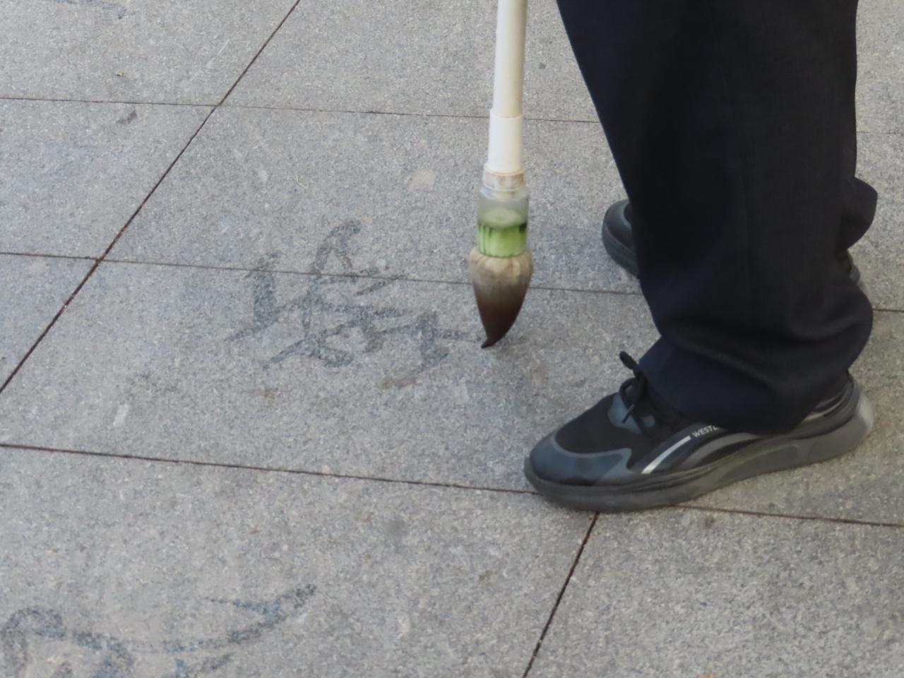 よく見れば、水を含ませたブラシで地面に字を書かれています。
