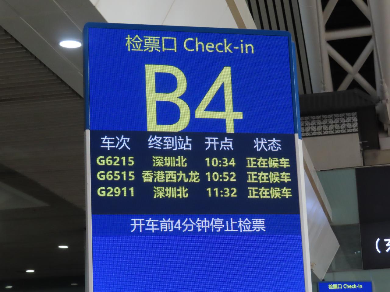 G6515 西九龍駅行き列車のゲートはA4(前4両)とB4(後ろ4両)に分かれています。
