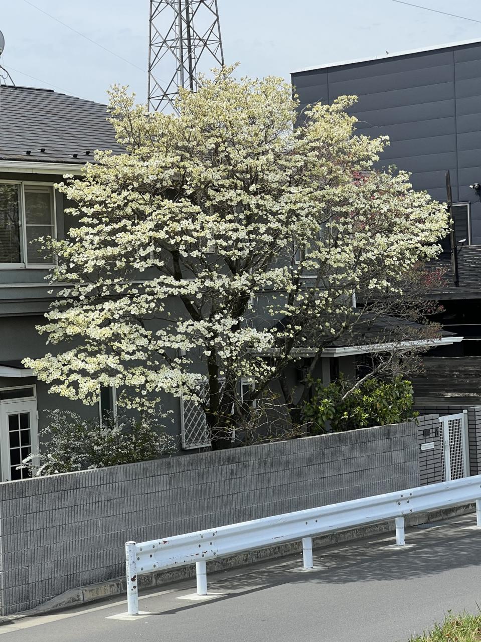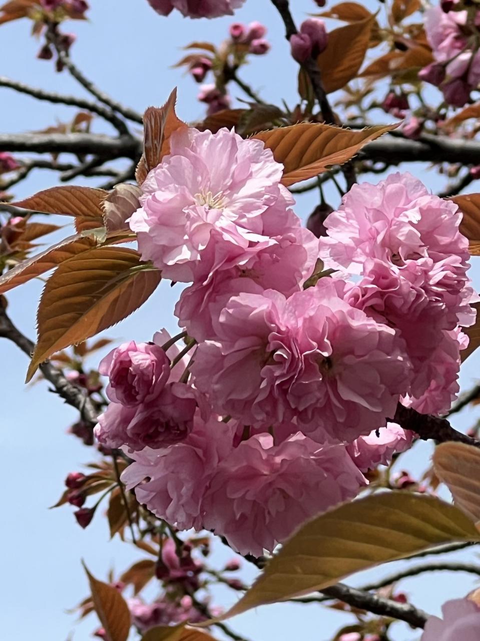 八重桜の道はまだ続いていました。住宅や学校の側を通り