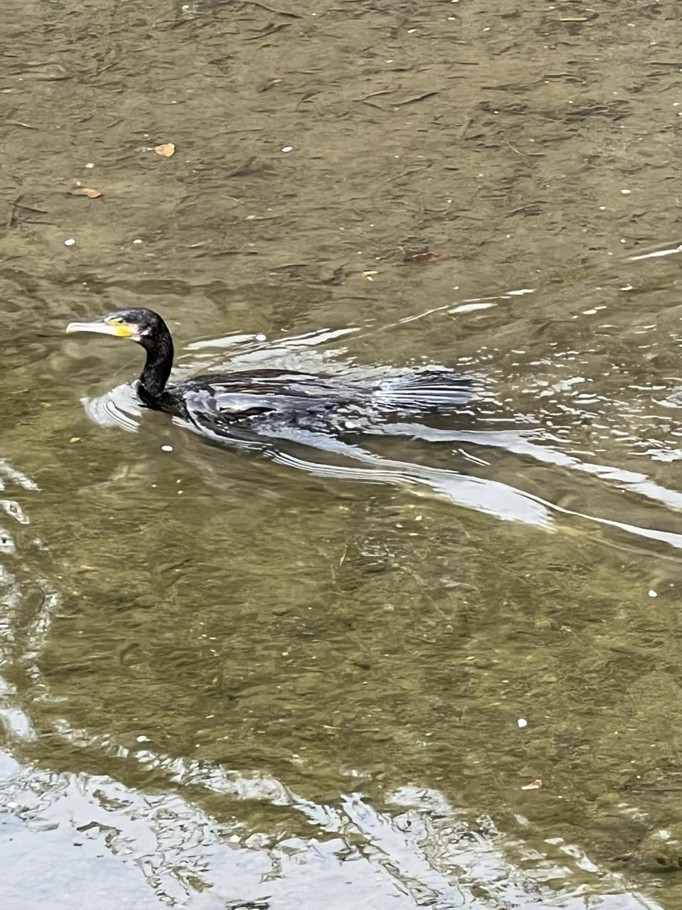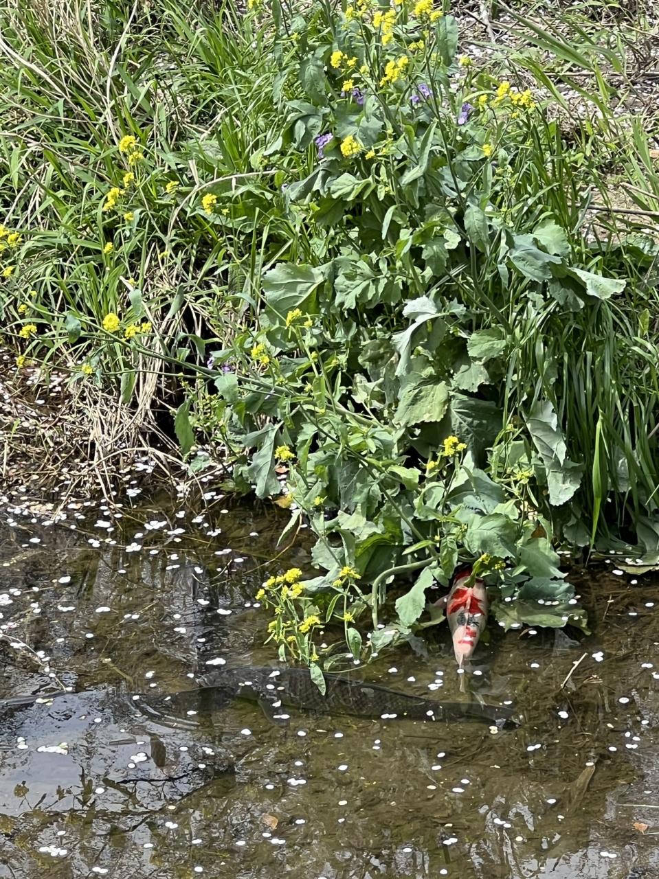 桜の花びらが浮かぶ水中で、お休み中の鯉♪カラフルな子は目立ちますね♪