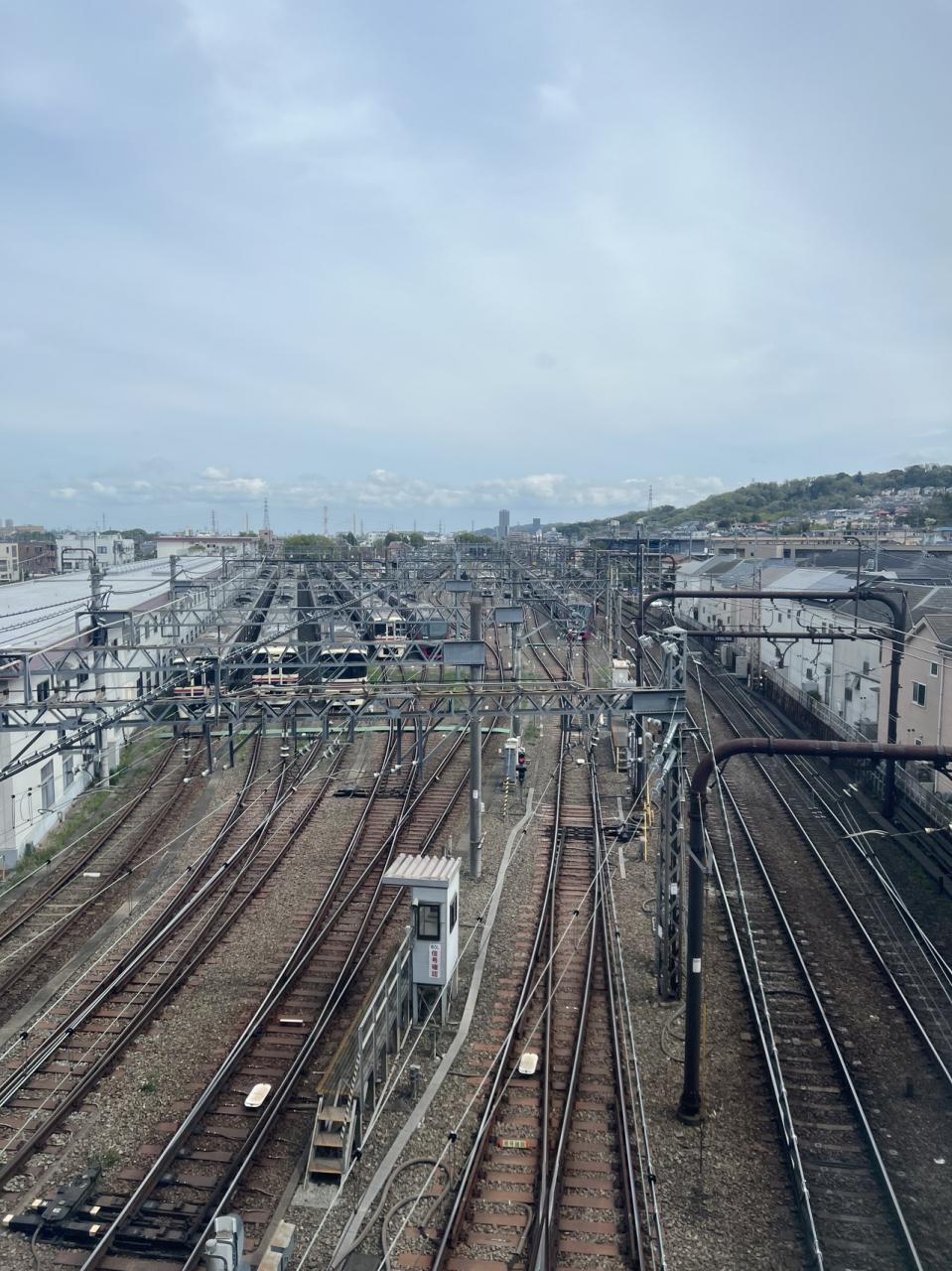 駅からの眺め。京王線の新宿方面を見ています。遠くにポツンと見えるビルは、先程の聖蹟桜ヶ丘駅辺りです。